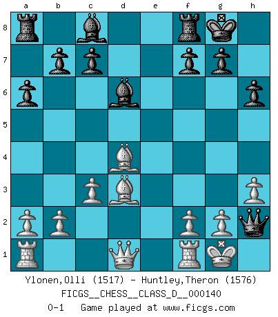 Last move : 0-1 2010 February 13 1:5:20 [Event "FICGS__CHESS__CLASS_D__000140"] [Site "FICGS"] [Date "2010.01.15"] [Round "1"] [White "Ylonen,Olli"] [Black "Huntley,Theron"] [Result "0-1"] [WhiteElo "1517"] [BlackElo "1576"] 1.e4 e6 2.d4 d5 3.Nc3 dxe4 4.Nxe4 a6 5.Bd3 Nf6 6.Nxf6+ Qxf6 7.Nf3 h6 8.O-O Nc6 9.Be3 Bd6 10.h3 O-O 11.c3 e5 12.dxe5 Nxe5 13.Nxe5 Qxe5 14.Bd4 Qh2+ 0-1 French : Rubinstein variation Kingside Castling by player White (move 8) Kingside Castling by player Black (move 10) Player Black won this chess game. Follow this game move after move (download)Chess teaches you to control the initial excitement you feel when you see something that looks good and it trains you to think objectively when you're in trouble. (Stanley Kubrick) Weshalb minderdergeübte Spieler mit g2-g4 beginnen? Die betreffenden sind unschlüssig, ob sie nun rechts (h4) oder links (f4) beginnen sollen, und in ihrer Ratlosigkeit entschliessen sie sich nach guter Bürgerart dazu, den goldenen Mittelweg zu wählen. (Aaron Nimzowitsch) En el Ajedrez, cuando menos, el valiente hereda la tierra. (Edmar Mednis) Aucun coup ne doit être joué sans but. (Pedro Damiano) Even the best needles are not sharp at both ends. (Chinese proverb)