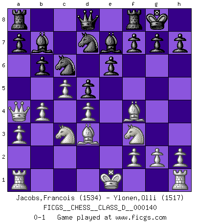 Last move : 0-1 2010 March 4 10:29:53 [Event "FICGS__CHESS__CLASS_D__000140"] [Site "FICGS"] [Date "2010.01.15"] [Round "1"] [White "Jacobs,Francois"] [Black "Ylonen,Olli"] [Result "0-1"] [WhiteElo "1534"] [BlackElo "1517"] 1.e4 Nf6 2.e5 Nd5 3.d4 e6 4.Nf3 d6 5.c4 Nb6 6.exd6 cxd6 7.Nc3 d5 8.c5 N6d7 9.Bf4 Nc6 10.a3 Be7 11.b4 O-O 12.Bd3 b6 13.Qa4 Bb7 0-1 Alekhine's defense Kingside Castling by player Black (move 11) Player Black won this chess game. Follow this game move after move (download)Chess holds its master in its own bonds, shackling the mind and brain so that the inner freedom of the very strongest must suffer. (Albert Einstein) Die größte Kunst beim Schach besteht darin dem Gegner nicht zu zeigen was er tun kann. (Garry Kasparov) Una clavada es mas poderosa que una espada. (Fred Reinfeld) Le jeu d'échecs est comme rejeté hors du temps. (Antoine de Saint-Exupéry) Philosophers use a language that is already deformed as though by shoes that are too tight. (Ludwig Wittgenstein)