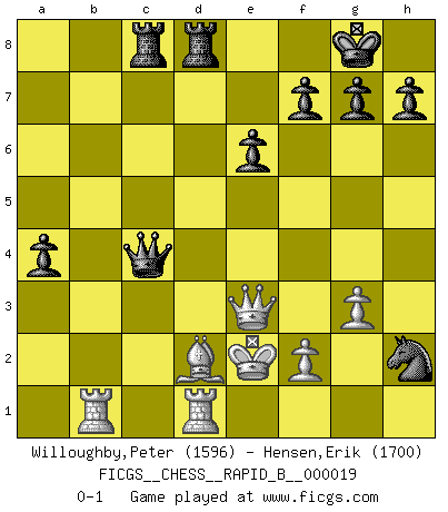 Last move : 0-1 2006 October 21 17:28:17 [Event "FICGS__CHESS__RAPID_B__000019"] [Site "FICGS"] [Date "2006.10.14"] [Round "1"] [White "Willoughby,Peter"] [Black "Hensen,Erik"] [Result "0-1"] [WhiteElo "1596"] [BlackElo "1700"] 1.e4 c5 2.Nf3 d6 3.Bb5+ Bd7 4.Bxd7+ Qxd7 5.O-O Nc6 6.c3 Nf6 7.Re1 e6 8.d4 cxd4 9.cxd4 d5 10.exd5 Nxd5 11.Nc3 Be7 12.Nxd5 Qxd5 13.Be3 O-O 14.b3 Rfd8 15.a3 Rac8 16.b4 b5 17.Qe2 a5 18.bxa5 Nxa5 19.a4 Nb3 20.Rab1 bxa4 21.g3 Bb4 22.Red1 Bc3 23.Nd2 Bxd2 24.Bxd2 Nxd4 25.Qe3 Nf3+ 26.Kf1 Nxh2+ 27.Ke2 Qc4+ 0-1 Sicilian : Canal-Sokolsky attack, 3...Bd7 Kingside Castling by player White (move 5) Kingside Castling by player Black (move 13) Player Black won this chess game. Follow this game move after move (download)During a Chess competition a Chessmaster should be a combination of a beast of prey and a monk. (Alexander Alekhine) Smyslow ist ein Beweis dafür, dass ich noch zehn Jahre spielen kann! [der 75 jährige über den 85 jährigen] (Viktor Kortschnoi) El Ajedrez es una guerra en un tablero. El objetivo es aplastar la mente del oponente. (Bobby Fischer) Les Echecs représentent une sphère d'idées créatrices basée sur la volonté des deux protagonistes. (Smyslov) Hold em is to stud what chess is to checkers. (Johnny Moss)