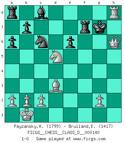 Last move : 1-0 2010 January 27 8:42:0 [Event "FICGS__CHESS__CLASS_D__000140"] [Site "FICGS"] [Date "2010.01.15"] [Round "1"] [White "Payzansky,Aleksey"] [Black "Brulland,Emmanuel"] [Result "1-0"] [WhiteElo "1799"] [BlackElo "1417"] 1.e4 c6 2.d4 d5 3.Nc3 e6 4.e5 a6 5.f4 c5 6.Nf3 Nc6 7.Be3 cxd4 8.Nxd4 Nxd4 9.Bxd4 Ne7 10.Bd3 g6 11.Qe2 Bg7 12.O-O-O Nc6 13.Bc5 Bf8 14.Qf2 Bxc5 15.Qxc5 Qe7 16.Qb6 O-O 17.h4 f5 18.exf6 Rxf6 19.h5 Rxf4 20.hxg6 hxg6 21.Bxg6 Qg5 22.Bh7+ Kf8 23.Kb1 Rf7 24.Bd3 Kg8 25.Rh2 Qd8 26.Qe3 Qf6 27.Rdh1 Kf8 28.Nxd5 Qg7 29.Rh8+ Qxh8 30.Rxh8+ Kg7 31.Qh6+ 1-0 Caro-Kann defense Queenside Castling by player White (move 12) Kingside Castling by player Black (move 16) Player White won this chess game. Follow this game move after move (download)Chess is a terrible game. If you have no center, your opponent has a freer position. If you do have a center, then you really have something to worry about ! (Siegbert Tarrasch) Schach ist mein Leben, meine Leidenschaft, was ich gelernt habe und seit meinem 14. Lebensjahr profimässig praktiziere. Darauf zu verzichten, würde mir sehr schwer fallen. (Viktor Kortschnoi) Cuando le juegas a Fischer, no es una cuestion de si vas a ganar o perder. Es una cuestion de si vas a sobrevivir. (Boris Spassky) Des points faibles ou des trous dans la position de l'adversaire doivent être occupés par des pièces et non pas par des pions. (Siegbert Tarrasch) The existence of forgetting has never been proved: We only know that some things don't come to mind when we want them. (Friedrich Nietzsche)