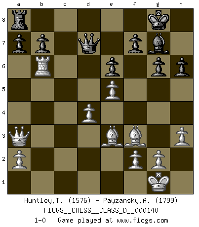 Last move : 1-0 2010 January 23 5:10:18 [Event "FICGS__CHESS__CLASS_D__000140"] [Site "FICGS"] [Date "2010.01.15"] [Round "1"] [White "Huntley,Theron"] [Black "Payzansky,Aleksey"] [Result "1-0"] [WhiteElo "1576"] [BlackElo "1799"] 1.c4 Nf6 2.Nf3 g6 3.Nc3 d5 4.Qa4+ c6 5.cxd5 Nxd5 6.e4 Nxc3 7.bxc3 Bg7 8.d4 O-O 9.Bg5 h6 10.Be3 Bg4 11.Be2 Nd7 12.O-O c5 13.Qa3 cxd4 14.cxd4 Nb6 15.Rac1 Qd7 16.h3 Bxf3 17.Bxf3 Rfc8 18.Rxc8+ Nxc8 19.e5 e6 20.Rb1 Nb6 21.Rxb6 1-0 English Opening Kingside Castling by player Black (move 8) Kingside Castling by player White (move 12) Player White won this chess game. Follow this game move after move (download)Some sacrifices are sound; the rest are mine. (Mikhail Tal) Strategie ist, wie man ein Mädchen auf den Rücksitz bekommt. Taktik ist, was man tut, wenn man dann dort ist. (Anonymous) Uno no tiene que jugar muy bien, es suficiente jugar mejor que el oponente. (Siegbert Tarrasch) Les Echecs sont affaire de jugement sensible. Savoir quand frapper et quand esquiver. (Fischer) Warrior pose battles inner weakness and wins focus. You see that there is no war within you. You're on your own side, and you are your own strength. (Terri Guillemets)