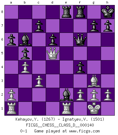 Last move : 0-1 2010 January 27 15:36:17 [Event "FICGS__CHESS__CLASS_D__000140"] [Site "FICGS"] [Date "2010.01.15"] [Round "1"] [White "Kehayov,Yulian"] [Black "Ignatyev,Vladimir"] [Result "0-1"] [WhiteElo "1267"] [BlackElo "1501"] 1.e4 e5 2.d4 exd4 3.Qxd4 Nc6 4.Qd1 Bc5 5.Nf3 Nge7 6.Bd3 d6 7.O-O Ng6 8.Nc3 a6 9.Qe1 O-O 10.e5 Ngxe5 11.Nxe5 Nxe5 12.Qe4 Nxd3 13.Qxd3 f5 14.Ne2 Be6 15.c3 b5 16.b4 Bc4 17.Qd1 Bb6 18.Re1 Qh4 19.Rf1 Rae8 20.Bf4 Bxe2 21.Qd5+ Kh8 22.Bg3 Qf6 23.Rfe1 f4 0-1 Centre game Kingside Castling by player White (move 7) Kingside Castling by player Black (move 9) Player Black won this chess game. Follow this game move after move (download)Nothing excites jaded Grandmasters more than a theoretical novelty. (Dominic Lawson) Schach ist das schnellste Spiel der Welt, weil man in jeder Sekunde Tausende von Gedanken ordnen muß. (Albert Einstein) Muchos se han convertido en Maestros de Ajedrez, nadie se ha convertido en el Maestro del Ajedrez. (Siegbert Tarrasch) La vie et les Echecs sont tous les deux une lutte constante. (Lasker) The message for business people contemplating their place in the cyberspace is simple and direct: get linked or get lost. (Vic Sussman and Kenan Pollack)