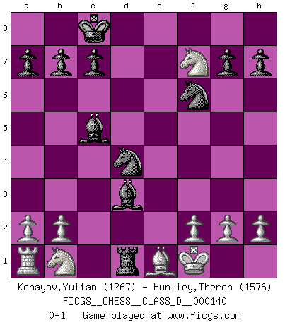 Last move : 0-1 2010 January 19 14:15:42 [Event "FICGS__CHESS__CLASS_D__000140"] [Site "FICGS"] [Date "2010.01.15"] [Round "1"] [White "Kehayov,Yulian"] [Black "Huntley,Theron"] [Result "0-1"] [WhiteElo "1267"] [BlackElo "1576"] 1.e4 e5 2.d4 exd4 3.Qxd4 Nc6 4.Qd1 Nf6 5.Bd3 d5 6.exd5 Qxd5 7.Nf3 Qe6+ 8.Qe2 Qxe2+ 9.Bxe2 Bc5 10.O-O Bf5 11.Re1 O-O-O 12.Ng5 Rhe8 13.Nxf7 Rxe2 14.Bd2 Rxe1+ 15.Bxe1 Rd1 16.Kf1 Bxc2 17.Ke2 Nd4+ 18.Kf1 Bd3+ 0-1 Centre game Kingside Castling by player White (move 10) Queenside Castling by player Black (move 11) Player Black won this chess game. Follow this game move after move (download)It is always better to sacrifice your opponent's men. (Savielly Tartakower) Obwohl ich alt bin, darf mir niemand den Finger in den Mund stecken, sonst beisse ich. (Wilhelm Steinitz) El Ajedrez hace al hombre ser mas sabio y ver mas claro. (Vladimir Putin) Même un GMI sait rarement calculer sur plus de cinq coups une attaque à sacrifices. (Rudolf Spielmann) Luck is when opportunity knocks and you answer. (Anonymous)