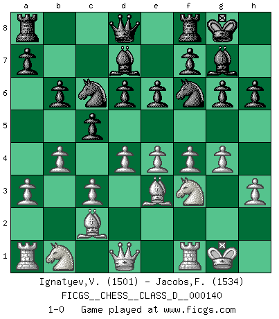 Last move : 1-0 2010 January 28 11:54:8 [Event "FICGS__CHESS__CLASS_D__000140"] [Site "FICGS"] [Date "2010.01.15"] [Round "1"] [White "Ignatyev,Vladimir"] [Black "Jacobs,Francois"] [Result "1-0"] [WhiteElo "1501"] [BlackElo "1534"] 1.e4 c5 2.f4 e6 3.c3 Nc6 4.Bd3 d6 5.Bc2 Nf6 6.Nf3 Qc7 7.O-O g6 8.a3 Bg7 9.h3 O-O 10.g4 h6 11.d3 Bd7 12.Be3 Qd8 13.b4 b6 14.d4 1-0 Sicilian : Grand Prix attack Kingside Castling by player White (move 7) Kingside Castling by player Black (move 9) Player White won this chess game. Follow this game move after move (download)I have never in my life played the French Defence, which is the dullest of all openings. (Wilhelm Steinitz) Habe Mut, dich deines eigenen Verstandes zu bedienen. (Immanuel Kant) El Ajedrez era la lengua materna de Capablanca. (Reti) Nous sommes les pions de la mystérieuse partie d'Echecs jouée par Dieu. Il nous déplace, nous arrête, nous pousse encore, puis nous lance un à un dans la boîte du Néant. Epitaphe sur la tombe de David Janowsky (1868-1927). If you have any trouble condescending, find a Unix user to show you how it's done. (Scott Adams)