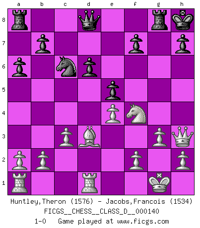 Last move : 1-0 2010 January 26 13:44:12 [Event "FICGS__CHESS__CLASS_D__000140"] [Site "FICGS"] [Date "2010.01.15"] [Round "1"] [White "Huntley,Theron"] [Black "Jacobs,Francois"] [Result "1-0"] [WhiteElo "1576"] [BlackElo "1534"] 1.e4 c5 2.Nf3 e6 3.d4 cxd4 4.Nxd4 Nf6 5.Nc3 Nc6 6.Ndb5 d6 7.Bf4 e5 8.Bg5 a6 9.Na3 Be6 10.Nc4 Be7 11.Bxf6 gxf6 12.Ne3 Bf8 13.Ncd5 Bg7 14.Bd3 O-O 15.Qd2 Bh6 16.Qe2 Ne7 17.Nxf6+ Kh8 18.O-O Ng6 19.Nfd5 Rg8 20.g3 Bh3 21.Nf5 Bf4 22.Rfd1 Nh4 23.Qh5 Nxf5 24.Qxh3 Nd4 25.c3 Nc6 26.Nxf4 1-0 Sicilian : Anderssen variation Kingside Castling by player Black (move 14) Kingside Castling by player White (move 18) Player White won this chess game. Follow this game move after move (download)The hardest game to win is a won game. (Emanuel Lasker) In Buenos Aires ist es nicht mein vorrangiges Ziel ein starkes Turnier zu organisieren, sondern ein Turnier für Gentlemen. Ich würde nie Kamsky einladen. Ich mag keine Probleme. (Miguel Najdorf) Cada Peón es potencialmente una Reina. (James Mason) Le succès, c'est être capable d'aller d'échec en échec sans perdre son enthousiasme. (Winston Churchill) The problem with manipulation is that people can turn on you. (Horatio Caine, C.S.I. Miami)
