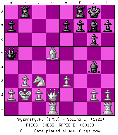 Last move : 0-1 2010 February 2 21:27:7 [Event "FICGS__CHESS__RAPID_B__000139"] [Site "FICGS"] [Date "2010.01.16"] [Round "1"] [White "Payzansky,Aleksey"] [Black "Solino,Leonardo"] [Result "0-1"] [WhiteElo "1799"] [BlackElo "1723"] 1.e4 c5 2.Nf3 g6 3.d4 cxd4 4.Nxd4 Nc6 5.Nc3 Bg7 6.Be3 Nf6 7.Qd2 O-O 8.O-O-O Ng4 9.Nxc6 bxc6 10.Bd4 Bh6 11.Be3 Nxe3 12.fxe3 Rb8 13.b3 Qa5 14.Kb2 Bg7 15.Bc4 d5 16.exd5 cxd5 17.Bxd5 Bg4 0-1 Sicilian : Hungarian variation Kingside Castling by player Black (move 7) Queenside Castling by player White (move 8) Player Black won this chess game. Follow this game move after move (download)What is the object of playing a gambit opening?... To acquire a reputation of being a dashing player at the cost of losing a game. (Siegbert Tarrasch) Über die Verhaftung Bobby Fischers: Warum es die Bush-Administration für nötig befindet einen 61 Jahre alten Mann zu hetzten, der für niemanden ausser sich selbste eine Gefahr darstellt ist ein Rätsel. (Nigel Short) El Ajedrez es en su esencia, un juego. En su forma, un arte. Y en su ejecución, una ciencia. (Baron Tassilo) Tout change constamment, y compris dans le monde des Echecs. (Botvinnik) The good fighters of old first put themselves beyond the possibility of defeat, and then waited for an opportunity of defeating the enemy. (Sun Tzu)