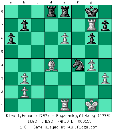 Last move : 1-0 2010 February 9 21:57:49 [Event "FICGS__CHESS__RAPID_B__000139"] [Site "FICGS"] [Date "2010.01.16"] [Round "1"] [White "Kirali,Hasan"] [Black "Payzansky,Aleksey"] [Result "1-0"] [WhiteElo "1797"] [BlackElo "1799"] 1.e4 c5 2.Nc3 Nc6 3.f4 g6 4.Bc4 Bg7 5.d3 e6 6.Nf3 Nge7 7.O-O d5 8.Bb3 O-O 9.Re1 Nd4 10.Ne5 Qc7 11.exd5 Nxb3 12.axb3 exd5 13.d4 Be6 14.dxc5 Qxc5+ 15.Be3 Qc7 16.Nb5 Qd8 17.Bc5 a6 18.Nd4 Re8 19.Nxe6 fxe6 20.Qd2 Nf5 21.Qf2 Nd6 22.Rad1 Qc7 23.Bb6 Qe7 24.c4 Bxe5 25.fxe5 Ne4 26.Qd4 Qb4 27.cxd5 Qxd4+ 28.Rxd4 exd5 29.Rxd5 Nf6 30.Rd6 Ng4 31.e6 Rac8 32.h3 Nf6 33.Bd4 Nh5 34.Rd7 Rcd8 35.g4 Nf4 36.Rg7+ 1-0 Sicilian : Grand Prix attack Kingside Castling by player White (move 7) Kingside Castling by player Black (move 8) Player White won this chess game. Follow this game move after move (download)Chess problems demand from the composer the same virtues that characterize all worthwhile art: originality, invention, conciseness, harmony, complexity, and splendid insincerity. (Vladimir Nabokov) Zu meiner Zeit war ein 20 jähriger ein junger Spieler, heute ist er ein Veteran. (Garry Kasparov) Un jugador que trata de regresar una movida en el Ajedrez es un futuro carterista. (Richard Fenton) La conception d'un plan est le processus par lequel un joueur exploite les avantages de sa position tout en s'efforçant d'en réduire au minimum les inconvénients. Afin de garantir le succès, un plan doit toujours se fonder sur un diagnostic objectif des particularités d'une position. La conception d'un plan est d'autant plus difficile que la position est équilibrée, et grandement facilitée lorsqu'il n'existe qu'un seul plan susceptible de répondre aux exigences de la position. (Harry Golombek) Creativity is inventing, experimenting, growing, taking risks, breaking rules, making mistakes, and having fun. (Mary Lou Cook)