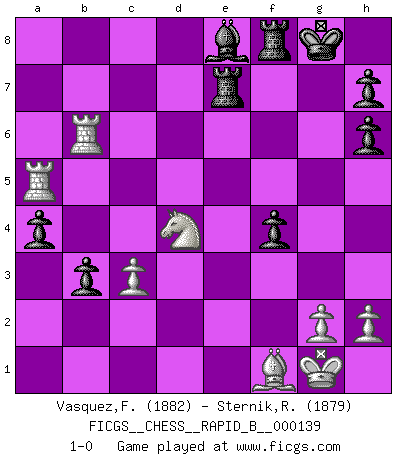 Last move : 1-0 2010 April 4 23:30:50 [Event "FICGS__CHESS__RAPID_B__000139"] [Site "FICGS"] [Date "2010.01.16"] [Round "1"] [White "Vasquez,Fernando"] [Black "Sternik,Ryszard"] [Result "1-0"] [WhiteElo "1882"] [BlackElo "1879"] 1.e4 e5 2.Nf3 Nc6 3.d4 exd4 4.Nxd4 Bc5 5.Be3 Qf6 6.c3 Nge7 7.Bc4 Ne5 8.Be2 d5 9.O-O O-O 10.Nd2 Bb6 11.f4 Qh6 12.Kh1 N5c6 13.Nxc6 bxc6 14.Bg1 Rb8 15.Bxb6 cxb6 16.Qa4 a5 17.Rae1 Rd8 18.Rf2 dxe4 19.Qxe4 Re8 20.Bc4 b5 21.Qe5 Rb7 22.Bf1 Be6 23.f5 Bxa2 24.b3 Rd7 25.Ne4 Bxb3 26.f6 Be6 27.fxe7 Rdxe7 28.Qd6 f5 29.Ng3 Bd7 30.Qxh6 gxh6 31.Rd1 a4 32.Kg1 Rf8 33.Rd6 c5 34.Rfd2 Be8 35.R2d5 b4 36.Rxc5 b3 37.Rb6 Bg6 38.Ra5 f4 39.Ne2 Be8 40.Nd4 1-0 Scotch game Kingside Castling by player White (move 9) Kingside Castling by player Black (move 9) Player White won this chess game. Follow this game move after move (download)An attack on the wing should be met by play in the center. (Nimzovitch) Garry Kasparov war erst in der Großmeister-Organisation GMA, dann in der Profischach-Vereinigung PCA, zum Schluss kehrte er wieder in den Schoß der FIDE zurück. Aber gut, manche Leute sind flexibel (Viswanathan Anand) Un entendimiento a fondo de las continuaciones típicas del mate, hace de las combinaciones de sacrificio mas complicadas conducirlas a ellas no solo sin dificultad, sino casi de una manera natural. (Siegbert Tarrasch) Il a essayé de se convaincre qu'il pourrait empêcher toutes les erreurs et ne jamais perdre. L'horreur ! Gary Kasparov au sujet de Robert Fischer. The modern world has divided itself into Conservatives and Progressives. The business of Progressives is to go on making mistakes. The business of the Conservatives is to prevent the mistakes from being corrected. (G.K. Chesterton)