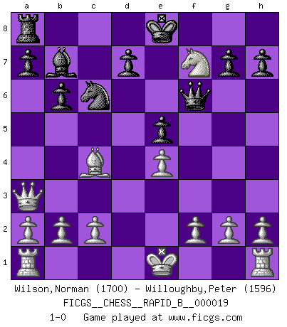 Last move : 1-0 2006 October 21 11:40:5 [Event "FICGS__CHESS__RAPID_B__000019"] [Site "FICGS"] [Date "2006.10.14"] [Round "1"] [White "Wilson,Norman"] [Black "Willoughby,Peter"] [Result "1-0"] [WhiteElo "1700"] [BlackElo "1596"] 1.e4 c5 2.Nf3 Nc6 3.d4 cxd4 4.Nxd4 e5 5.Nb5 Nf6 6.N1c3 Bb4 7.Bg5 Be7 8.Bxf6 Bxf6 9.Nd6+ Kf8 10.Qd5 Qe7 11.Bc4 Qe6 12.Qc5 Qe7 13.Nd5 b6 14.Qa3 Qe6 15.Nxf6 Qxf6 16.Nxf7 Ke8 17.Nxh8 Bb7 18.Nf7 1-0 Sicilian : Labourdonnais-Loewenthal variation Player White won this chess game. Follow this game move after move (download)Later, I began to succeed in decisive games. Perhaps because I realized a very simple truth: not only was I worried, but also my opponent. (Mikhail Tal) Irgendwie scheint mir sonntags früh um 9 Uhr der Killerinstinkt verloren gegangen zu sein. (Alexej Shirov) Un Peón pasado aumenta su poder a medida de que el número de piezas en el tablero disminuye. (Capablanca) Il vaut toujours mieux jouer un plan faux de façon logique que de n'avoir pas de plan du tout. (Victor Kortchnoï) When it is a question of money, everybody is of the same religion. (Voltaire)