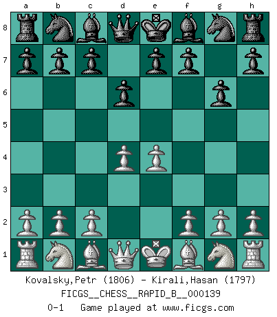 Last move : 0-1 2010 March 5 9:38:24 [Event "FICGS__CHESS__RAPID_B__000139"] [Site "FICGS"] [Date "2010.01.16"] [Round "1"] [White "Kovalsky,Petr"] [Black "Kirali,Hasan"] [Result "0-1"] [WhiteElo "1806"] [BlackElo "1797"] 1.e4 d6 2.d4 g6 0-1 This chess game has been lost on time (started : 2010.01.16 14:6:3) King's pawn Opening Player Black won this chess game. Follow this game move after move (download)What would Chess be without silly mistakes ? (Kurt Richter) Ich würde die 30 stärksten Spieler der USA im Simultanspiel besiegen. (José Raúl Capablanca) Cuando tu no sabes absolutamente que mas hacer, es tiempo de entrar en pánico. (John van der Wiel) On a dit que l'homme se distingue de l'animal par le fait qu'il achète plus de livres qu'il ne peut en lire. Je voudrais suggérer qu'inclure à la liste des livres quelques livres d'échecs rendrait la distinction manifeste. (Edward Lasker) Children in the dark cause accidents, accidents in the dark cause children. (Unknown)