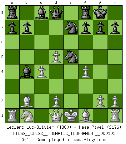 Last move : 0-1 2010 February 16 13:39:36 [Event "FICGS__CHESS__THEMATIC_TOURNAMENT__000103"] [Site "FICGS"] [Date "2010.01.18"] [Round "1"] [White "Leclerc,Luc-Olivier"] [Black "Hase,Pavel"] [Result "0-1"] [WhiteElo "1800"] [BlackElo "2176"] 1.f4 d5 2.Nf3 c5 3.c4 d4 4.b4 cxb4 5.a3 e6 6.Bb2 Nc6 7.axb4 Bxb4 8.e3 e5 9.Nxe5 Nge7 10.exd4 O-O 11.d5 Nxe5 0-1 Bird's Opening Kingside Castling by player Black (move 10) Player Black won this chess game. Follow this game move after move (download)By playing at Chess then, we may learn: First: Foresight... Second: Circumspection... Third: Caution... And lastly, we learn by Chess the habit of not being discouraged by present bad appearances in the state of our affairs, the habit of hoping for a favorable chance, and that of persevering in the secrets of resources. (Benjamin Franklin) Ich hatte Zahnschmerzen im ersten Spiel. In der zweiten Partie tat mir der Kopf weh. In der dritten war es eine Rheuma-Attacke und während der vierten fühlte ich mich nicht gut. Und in der fünften? Nun, man muss doch nicht jedes Spiel gewinnen, oder? (Savielly Grigorievitsch Tartakower) Me siento como si fuera una pieza en una partida de Ajedrez, cuando mi oponente me indica: esa pieza no puede ser movida. (Soren Kierkegaard) Fischer est le meilleur joueur du monde et Karpov n'est qu'un joueur de bistrot. (Garry Kasparov, agé de 16 ans) The Internet is so big, so powerful and pointless that for some people it is a complete substitute for life. (Andrew Brown)