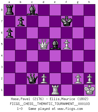 Last move : 1-0 2010 March 22 18:18:22 [Event "FICGS__CHESS__THEMATIC_TOURNAMENT__000103"] [Site "FICGS"] [Date "2010.01.18"] [Round "1"] [White "Hase,Pavel"] [Black "Ellis,Maurice"] [Result "1-0"] [WhiteElo "2176"] [BlackElo "1802"] 1.f4 d5 2.Nf3 c5 3.c4 d4 4.b4 cxb4 5.a3 e6 6.axb4 Bxb4 7.Bb2 Nc6 8.e3 e5 9.Nxe5 Nge7 10.exd4 O-O 11.Bd3 Nxd4 12.O-O f6 13.Ng4 Bc5 14.Kh1 Qb6 15.Bxd4 Bxd4 16.Nc3 Qc5 17.Rb1 Rd8 18.Rb5 Qd6 19.Nd5 a6 20.Nxe7+ Qxe7 21.Rh5 h6 22.f5 Qc5 23.Nxh6+ gxh6 24.Rxh6 Kf8 25.Re1 Be5 26.Bc2 Qd4 27.c5 Qxc5 28.Qh5 Ke7 29.Rxf6 Kxf6 30.Qh4+ Kg7 31.Qg5+ Kf7 32.Qxd8 Qxc2 33.Qd5+ 1-0 Bird's Opening Kingside Castling by player Black (move 10) Kingside Castling by player White (move 12) Player White won this chess game. Follow this game move after move (download)A man without frontiers. He didn't divide the East and the West, he brought them together in their admiration for him. (Ljubomir Ljubojevic, about Bobby Fischer's death) Privat ist Kortschnoi kein schlechter Mensch, sehr sympathisch. Aber während des Spiels ist er grausam. Er will dich töten. (Miguel Najdorf) ¡Examina movidas que hagan daño! Un buen ojo for movidas desvastantes es mucho mas importante que el conocimiento de principios estratégicos. (Purdy) La tactique, c'est ce que vous faites quand il y a quelque chose à faire; la stratégie, c'est ce que vous faites quand il n'y a rien à faire. (Savielli Tartacower) I believe in luck. How else can you explain the success of those you dislike ? (Jean Cocteau)