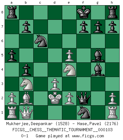 Last move : 0-1 2010 February 21 15:1:32 [Event "FICGS__CHESS__THEMATIC_TOURNAMENT__000103"] [Site "FICGS"] [Date "2010.01.18"] [Round "1"] [White "Mukherjee,Deepankar"] [Black "Hase,Pavel"] [Result "0-1"] [WhiteElo "1528"] [BlackElo "2176"] 1.f4 d5 2.Nf3 c5 3.c4 d4 4.b4 cxb4 5.d3 Nh6 6.Bb2 Nf5 7.Nbd2 Nc6 8.Nb3 a5 9.g4 Ne3 10.Qc1 e5 11.fxe5 Bxg4 12.Nfxd4 Qh4+ 13.Kd2 Be7 14.Nb5 Bg5 15.Qb1 Qf2 16.Nd6+ Kf8 17.Ne4 Nxc4+ 18.Kd1 Ne3+ 19.Kd2 Nxf1+ 0-1 Bird's Opening Player Black won this chess game. Follow this game move after move (download)If cunning alone were needed to excel, women would be the best Chess players. (Albin) Der Verteidiger gebe der Gewalt nach, aber nur der Gewalt. Er schaffe sich nicht freiwillig, etwa aus Blindheit oder aus Schrecken, irgendwelche Schwächen. Er lasse sich nicht bluffen. (Emanuel Lasker) Fischer era un maestro de claridad y un Rey del posicionamiento astuto. Sus oponentes podían ver hacia donde se dirigía pero eran impotentes para detenerlo. (Bruce Pandolfini) Le pion, dans sa simplicité, marche droit devant lui, mais lorsqu'il prend, il le fait obliquement? Ainsi l'homme, tant qu'il reste pauvre, marche dans la droiture et vit honnêtement, mais lorsqu'il recherche les honneurs, il flatte, se parjure et, par les voies obliques, cherche une position supérieure sur l'échiquier du monde. (Jean de Galles) I teach you to lie, cheat and steal, and as soon as my back's turned you wait in line ? (Gregory House, House M.D.)
