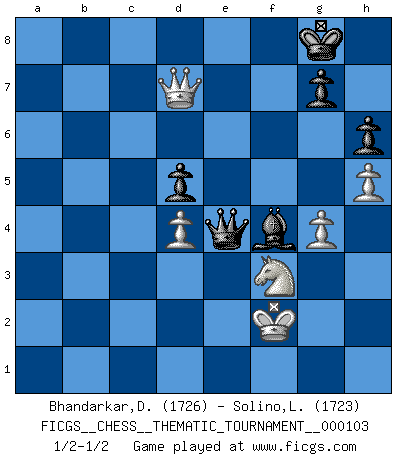 Last move : 1/2-1/2 2010 April 3 14:58:46 [Event "FICGS__CHESS__THEMATIC_TOURNAMENT__000103"] [Site "FICGS"] [Date "2010.01.18"] [Round "1"] [White "Bhandarkar,Dinesh"] [Black "Solino,Leonardo"] [Result "1/2-1/2"] [WhiteElo "1726"] [BlackElo "1723"] 1.f4 d5 2.Nf3 c5 3.c4 d4 4.b4 cxb4 5.a3 e6 6.Bb2 Nc6 7.axb4 Bxb4 8.e3 Bc5 9.Qb3 Bb6 10.Qa3 Nge7 11.c5 Bc7 12.Bxd4 Nxd4 13.Nxd4 O-O 14.Bd3 Bxf4 15.Nf3 Bc7 16.O-O Qd5 17.Bc2 Bd7 18.Nc3 Qh5 19.Rab1 Bc6 20.Be4 Nd5 21.Nb5 Bxb5 22.Rxb5 b6 23.cxb6 axb6 24.Qb3 Rfd8 25.Rc1 Rac8 26.Rc4 Rd7 27.Qc2 f5 28.Bxd5 exd5 29.Rc6 Qe8 30.R5xb6 f4 31.Rb3 fxe3 32.Rxe3 Qd8 33.Rec3 Bb6+ 34.d4 Rdc7 35.h4 Qd7 36.Rxc7 Rxc7 37.h5 Rxc3 38.Qxc3 Qe6 39.Kf2 h6 40.Qb3 Bc7 41.g4 Qe4 42.Qc3 Bf4 43.Qc8+ Kf7 44.Qd7+ Kg8 45.Qc8+ Kf7 46.Qd7+ Kg8 1/2-1/2 Bird's Opening Kingside Castling by player Black (move 13) Kingside Castling by player White (move 16) This chess game ended in a draw. Follow this game move after move (download)Of Chess it has been said that life is not long enough for it, but that is the fault of life, not Chess. (William Ewart Napier) Verschiedene, sehr schätzbare und im Laufe des Lebens nützliche Eigenschaften des Geistes können durch das Schachspiel erworben und gekräftigt werden, so dass sie zu Gewohnheiten werden, die uns nie im Stich lassen. (Benjamin Franklin) Algunos sacrificios son sólidos, los demás son míos. (Mikhail Tal) Toutes choses étant égales, c'est la conviction qui gagne. Alliée à une volonté de vaincre, elle sert de détonateur, suscite des idées, disperse les doutes et aide à penser clairement. (Robert Fischer) Train yourself to let go of everything you fear to lose. (Master Yoda in Star Wars ep.3)