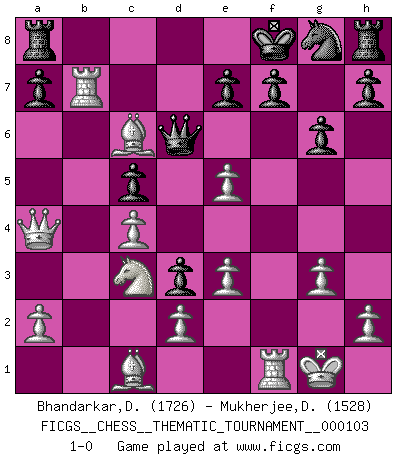 Last move : 1-0 2010 February 21 15:2:34 [Event "FICGS__CHESS__THEMATIC_TOURNAMENT__000103"] [Site "FICGS"] [Date "2010.01.18"] [Round "1"] [White "Bhandarkar,Dinesh"] [Black "Mukherjee,Deepankar"] [Result "1-0"] [WhiteElo "1726"] [BlackElo "1528"] 1.f4 d5 2.Nf3 c5 3.c4 d4 4.b4 b6 5.g3 Bb7 6.Bg2 g6 7.O-O Bg7 8.bxc5 d3 9.Nc3 bxc5 10.Rb1 Bd4+ 11.e3 Bg7 12.Rxb7 Nc6 13.Qa4 Qd6 14.Ne5 Bxe5 15.Bxc6+ Kf8 16.fxe5 1-0 Bird's Opening Kingside Castling by player White (move 7) Player White won this chess game. Follow this game move after move (download)Is Bobby Fischer quite sane ? (Salo Flohr) Die Arbeit ist etwas Unnatürliches. Die Faulheit allein ist göttlich. (Anatole France) En la vida, como en el Ajedrez, los Peones propios obstruyen nuestro camino. La gran fortuna de un hombre, su comodidad, placer, hijos, libros, que deberían ayudarle a ganar, con mucha frecuencia lo ponen en Jaque Mate. (Charles Buxton) Botvinnik disait en comparant les échecs à la musique: Il existe une science dont le but est l'étude de l'acoustique et des sons. Mais il y a aussi un art qui se sert de l'océan des sons : c'est la musique. De toute évidence, il en est de même pour la pensée. La logique est l'étude des lois de la réflexion et les échecs reflètent, en tant qu'art, le côté logique de la réflexion, sous la forme d'images artistiques... Extrait de Fischer - Spassky, Reykjavik 1972 par Alexander & F. Wyndham (Ed. Solar), p 37. However beautiful the strategy, you should occasionally look at the results. (Winston Churchill)