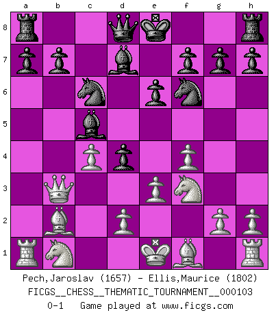 Last move : 0-1 2010 April 13 2:18:42 [Event "FICGS__CHESS__THEMATIC_TOURNAMENT__000103"] [Site "FICGS"] [Date "2010.01.18"] [Round "1"] [White "Pech,Jaroslav"] [Black "Ellis,Maurice"] [Result "0-1"] [WhiteElo "1657"] [BlackElo "1802"] 1.f4 d5 2.Nf3 c5 3.c4 d4 4.b4 cxb4 5.a3 e6 6.axb4 Bxb4 7.Bb2 Nc6 8.e3 Bc5 9.Qa4 Bd7 10.Qb3 Nf6 0-1 Bird's Opening Player Black won this chess game. Follow this game move after move (download)The stomach is an essential part of the Chess master. (Bent Larsen) Eine Person mit durchschnittlichem IQ kann etwa eine ELO von 2000 erreichen. (Jonathan Levitt) Todo lo que importa ante el tablero de Ajedrez son buenas jugadas. (Bobby Fischer) C'est une question de caractère, Beaucoup de gens perdent leur motivation très vite. D'autres, ils sont rares, peuvent la conserver très longtemps. J'aime les échecs, encore aujourd'hui je suis heureux d'analyser des parties. J'aime toujours gagner, je déteste encore perdre. Bien jouer est important pour mon intégrité intellectuelle et morale. Et puis les échecs vivent en ce moment une période historique grâce à Internet. Ils se développent dans les systèmes éducatifs à travers le monde. Ils sortent de leur ghetto, et c'est mon rôle de mener à bien cette révolution. (Gary Kasparov) Rules and bones are meant to be broken. (Anonymous)