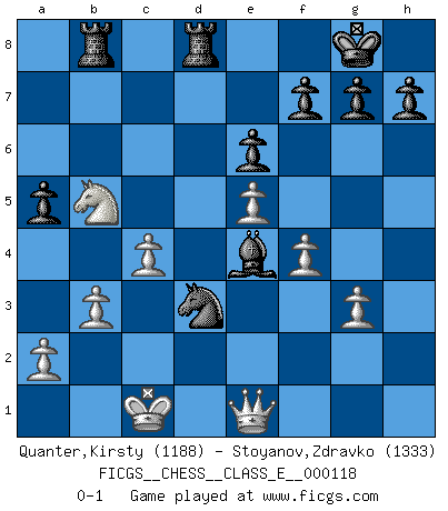 Last move : 0-1 2010 February 17 19:6:2 [Event "FICGS__CHESS__CLASS_E__000118"] [Site "FICGS"] [Date "2010.01.19"] [Round "1"] [White "Quanter,Kirsty"] [Black "Stoyanov,Zdravko"] [Result "0-1"] [WhiteElo "1188"] [BlackElo "1333"] 1.e4 c5 2.f4 Nc6 3.Bb5 a6 4.Bxc6 dxc6 5.b3 e6 6.Ba3 b6 7.c4 Qd4 8.Ne2 Qxa1 9.Nec3 b5 10.Qc2 Qxc3 11.Qxc3 b4 12.Qe5 bxa3 13.Nxa3 Nf6 14.Qc7 Nd7 15.Qxc6 Rb8 16.e5 Be7 17.Qe4 Bb7 18.Qe2 Bh4+ 19.Kd1 O-O 20.Kc1 Bc6 21.g3 Bxg3 22.hxg3 Bxh1 23.Qd3 Rfd8 24.Qf1 Bc6 25.Nc2 a5 26.d4 cxd4 27.Nxd4 Be4 28.Qe1 Nc5 29.Nb5 Nd3+ 0-1 Sicilian : Grand Prix attack Kingside Castling by player Black (move 19) Player Black won this chess game. Follow this game move after move (download)Chess is above all, a fight ! (Emanuel Lasker) Den Ruhm habe ich schon, jetzt brauche ich noch das Geld. (Wilhelm Steinitz) El ganar no lo es todo... pero el perder es nada. (Mednis) Ne tendez aucun piège pour le plaisir ! Ne jouez rien dans l'espoir que l'adversaire réagisse de façon stupide ! Prenez toujours pour acquis que l'adversaire va trouver le meilleur coup ! Ne jouez jamais de coup dans l'espoir que l'adversaire ne voie pas la menace ! Chacun de vos coups doit améliorer la position d'une façon ou d'une autre. It's not the will to win, but the will to prepare to win that makes the difference. (Bear Bryant)