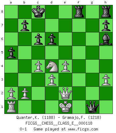 Last move : 0-1 2010 February 26 23:58:49 [Event "FICGS__CHESS__CLASS_E__000118"] [Site "FICGS"] [Date "2010.01.19"] [Round "1"] [White "Quanter,Kirsty"] [Black "Gramajo,Francisco"] [Result "0-1"] [WhiteElo "1188"] [BlackElo "1218"] 1.e4 e5 2.Nf3 Nc6 3.g3 Nf6 4.Bh3 Nxe4 5.d3 Nf6 6.Be3 d6 7.Bxc8 Qxc8 8.c4 Ng4 9.h3 Nxe3 10.fxe3 Qf5 11.e4 Qg6 12.g4 O-O-O 13.Nc3 Nd4 14.Nxd4 exd4 15.Nd5 f5 16.gxf5 Qg3+ 17.Kd2 c6 18.Nb4 a5 19.Nc2 g6 20.fxg6 Bh6+ 21.Ke2 Qg2+ 22.Ke1 Qxh1+ 23.Ke2 Qg2+ 24.Ke1 Qxg6 25.Qe2 Rdf8 26.Nxd4 Qg1+ 0-1 Konstantinopolsky Opening Queenside Castling by player Black (move 12) Player Black won this chess game. Follow this game move after move (download)We don't really know how the game was invented, though there are suspicions. As soon as we discover the culprits, we'll let you know. (Bruce Pandolfini) Ich würde die 30 stärksten Spieler der USA im Simultanspiel besiegen. (José Raúl Capablanca) Un mal plan es mejor que no tener ningún plan. (Frank Marshall) D'abord les bases : Jouez et étudiez, puis étudiez et jouez, ensuite jouez et étudiez, puis étudiez et jouez. Deuxièmement : Donnez toujours le meilleur de vous-même ! (Ken Smith) Methinks King Thibault should dub Marius Zubac a knight of the square board... I mean table, henceforth addressing him as Sir Marius, and bestow on him a suitable land from the kingdom of FICGS & marry him off to a worthy, fair maiden, lest he slice our heads with his mighty sword in his wrath. (Dinesh De Silva)