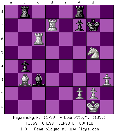 Last move : 1-0 2010 January 26 15:49:50 [Event "FICGS__CHESS__CLASS_E__000118"] [Site "FICGS"] [Date "2010.01.19"] [Round "1"] [White "Payzansky,Aleksey"] [Black "Leurette,Marc-Antoine"] [Result "1-0"] [WhiteElo "1799"] [BlackElo "1397"] 1.e4 e5 2.Nf3 Nc6 3.Bb5 Nf6 4.O-O Bc5 5.c3 O-O 6.d4 Bb6 7.Re1 d6 8.h3 Bd7 9.Nbd2 a6 10.Ba4 Na5 11.Bc2 c5 12.dxe5 dxe5 13.Nxe5 Bc7 14.Ndf3 Be6 15.Qxd8 Raxd8 16.b4 cxb4 17.cxb4 Nc6 18.Nxc6 bxc6 19.Bg5 a5 20.a3 Bb6 21.e5 h6 22.exf6 hxg5 23.fxg7 Kxg7 24.Nxg5 axb4 25.axb4 c5 26.Rxe6 Rb8 27.Rc6 cxb4 28.Bb3 Bd4 29.Rd1 Bc3 30.Rd7 1-0 Ruy Lopez : Berlin defense, Beverwijk variation Kingside Castling by player White (move 4) Kingside Castling by player Black (move 5) Player White won this chess game. Follow this game move after move (download)Bobby Fischer is the greatest Chess genius of all time ! (Alexander Kotov) Die Partien sind immer verschieden, die Interviews immer die gleichen. (Garry Kasparov) El Ajedrez es un cuento de Hadas de las 1001 metidas de pata. (Savielly Tartakower) Ce qui caractérise les parties de combat, c'est que si le défenseur a constamment de difficiles problèmes à résoudre, l'attaquant doit chercher sans relâche de nouvelles possibilités d'attaque. (Koblentz) The large trees attract high winds. (Chinese proverb)