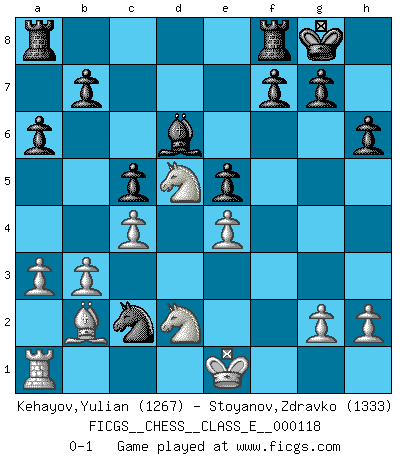 Last move : 0-1 2010 January 22 14:3:39 [Event "FICGS__CHESS__CLASS_E__000118"] [Site "FICGS"] [Date "2010.01.19"] [Round "1"] [White "Kehayov,Yulian"] [Black "Stoyanov,Zdravko"] [Result "0-1"] [WhiteElo "1267"] [BlackElo "1333"] 1.e4 c5 2.Nf3 d5 3.d3 dxe4 4.dxe4 Qxd1+ 5.Kxd1 Bg4 6.Be2 a6 7.c4 Nc6 8.a3 e5 9.Nfd2 Bxe2+ 10.Kxe2 Nf6 11.Re1 Nd4+ 12.Kd1 Bd6 13.Nc3 h6 14.b3 O-O 15.Bb2 Ng4 16.Nd5 Nxf2+ 17.Kc1 Nd3+ 18.Kd1 Nxe1 19.Kxe1 Nc2+ 0-1 Sicilian defense Kingside Castling by player Black (move 14) Player Black won this chess game. Follow this game move after move (download)When you don't know what to do, wait for your opponent to get an idea - it's sure to be wrong. (Tarrasch) Um dein Spiel zu verbessern musst du zuallererst das Endspiel studieren, denn diese kann unabhängig studiert werden. Die Eröffnung und das Mittelspiel müssen immer in Bezug gesetzt werden zum Endspiel. (José Raúl Capablanca) Fischer es una tragedia del Ajedrez Americano a la par con Morphy y Pillsbury. (Mig Greengard) Si rien de grave n'est détecté lors de l'analyse d'une position, on joue alors le coup. Seconde règle de Blumenfeld. Unless I accept my faults I will most certainly doubt my virtues. (Hugh Prather)