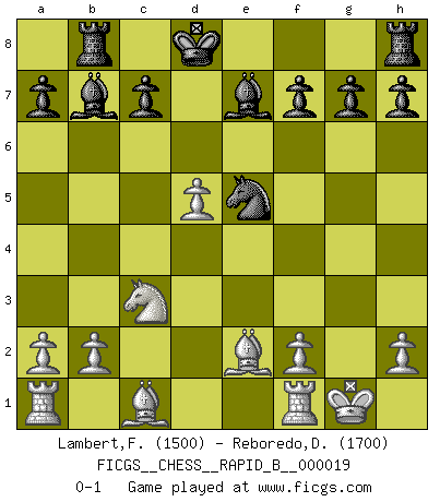 Last move : 0-1 2006 December 20 7:31:45 [Event "FICGS__CHESS__RAPID_B__000019"] [Site "FICGS"] [Date "2006.10.14"] [Round "1"] [White "Lambert,Frederic"] [Black "Reboredo,Daniel"] [Result "0-1"] [WhiteElo "1500"] [BlackElo "1700"] 1.e4 e5 2.Nf3 Nc6 3.Bc4 Nf6 4.Ng5 d5 5.exd5 Nd4 6.c3 b5 7.Bf1 Nxd5 8.cxd4 Qxg5 9.Bxb5+ Kd8 10.Qf3 Bb7 11.O-O Rb8 12.dxe5 Ne3 13.Qh3 Qxg2+ 14.Qxg2 Nxg2 15.d4 Be7 16.d5 Nh4 17.Be2 Ng6 18.Nc3 Nxe5 0-1 This chess game has been lost on time (started : 2006.10.14 20:16:39) Two knights defense : Fritz variation Kingside Castling by player White (move 11) Player Black won this chess game. Follow this game move after move (download)The defensive power of a pinned piece is only imaginary. (Aaron Nimzovich) Frage: Wie viele Autos haben Sie schon zerstört? - Antwort: Nur zwei. (Loek van Wely) Ciertamente, de todas la drogas del mundo, el Ajedrez debe ser el mas placentero permamentemente. (Assiac) Soyez une menace à chaque fois que vous vous asseyez pour jouer. (Ken Smith) Every now and then a man's mind is stretched by a new idea and never shrinks back to its former dimensions. (Oliver Wendell Holmes, Sr.)