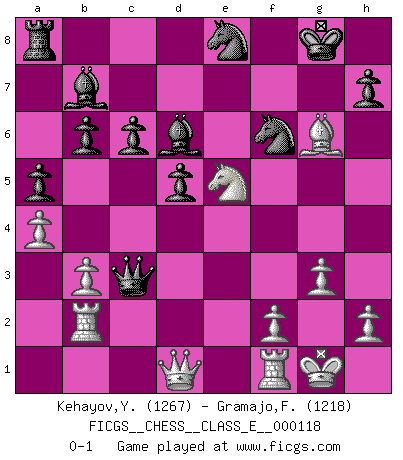 Last move : 0-1 2010 January 29 21:42:10 [Event "FICGS__CHESS__CLASS_E__000118"] [Site "FICGS"] [Date "2010.01.19"] [Round "1"] [White "Kehayov,Yulian"] [Black "Gramajo,Francisco"] [Result "0-1"] [WhiteElo "1267"] [BlackElo "1218"] 1.d4 d5 2.Nc3 Nf6 3.e3 g6 4.Bd3 Bg7 5.Nf3 O-O 6.O-O e6 7.Nb1 Nbd7 8.c4 c6 9.b3 b6 10.Nc3 a5 11.a4 Qc7 12.e4 Bb7 13.e5 Ne8 14.cxd5 exd5 15.Ba3 f6 16.Bxf8 Bxf8 17.exf6 Ndxf6 18.Rb1 Qf4 19.Rb2 Bd6 20.g3 Qg4 21.Ne5 Qxd4 22.Bxg6 Qxc3 0-1 Queen's pawn : Chigorin variation Kingside Castling by player Black (move 5) Kingside Castling by player White (move 6) Player Black won this chess game. Follow this game move after move (download)Pawns are born free, yet they are everywhere in chains. (Rick Kennedy) Im Schach gibt es keinen Platz für Galanterie. (Irving Chernev) Nunca nadie ha ganado una partida de Ajedrez rindiendose. (Unknown) La menace est plus forte que l'exécution. (Aaron Nimzovitch) The real danger is not that computers will begin to think like men, but that men will begin to think like computers. (Sydney J. Harris)