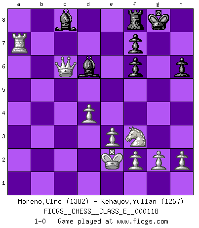 Last move : 1-0 2010 January 22 8:38:31 [Event "FICGS__CHESS__CLASS_E__000118"] [Site "FICGS"] [Date "2010.01.19"] [Round "1"] [White "Moreno,Ciro"] [Black "Kehayov,Yulian"] [Result "1-0"] [WhiteElo "1382"] [BlackElo "1267"] 1.c4 e5 2.Nc3 Nf6 3.Nf3 c6 4.Nxe5 Bd6 5.Nf3 O-O 6.d4 Bc7 7.Bg5 h6 8.Bxf6 Qxf6 9.e3 a6 10.Be2 b5 11.b4 a5 12.a3 axb4 13.axb4 Rxa1 14.Qxa1 Na6 15.cxb5 Nxb4 16.Qb1 Nd5 17.Ne4 Nc3 18.Nxf6+ gxf6 19.Qc2 Nxe2 20.Kxe2 Bb7 21.Ra1 Bd6 22.Ra7 Bc8 23.bxc6 dxc6 24.Qxc6 1-0 English Opening Kingside Castling by player Black (move 5) Player White won this chess game. Follow this game move after move (download)Man is a frivolous, a specious creature, and like a Chess player, cares more for the process of attaining his goal than for the goal itself. (Dostoyevsky) Ich trinke, ich rauche, ich spiele, ich liebe Frauen aber Fernschach ist ein Laster, das ich nicht habe. (Mikhail Nekhemyevich Tal) El sobresalir en el Ajedrez es un signo de una mente intrigante. (Sir Arthur Conan Doyle) Il vaut mieux sacrifier les pièces de l'adversaire. (Xavier Tartacover) Be who you are, and say what you feel because those who mind don't matter, and those who matter don't mind. (Dr Seuss)