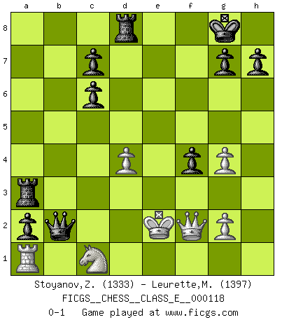 Last move : 0-1 2010 January 29 17:54:7 [Event "FICGS__CHESS__CLASS_E__000118"] [Site "FICGS"] [Date "2010.01.19"] [Round "1"] [White "Stoyanov,Zdravko"] [Black "Leurette,Marc-Antoine"] [Result "0-1"] [WhiteElo "1333"] [BlackElo "1397"] 1.e4 e5 2.Nf3 Nc6 3.Bb5 Nf6 4.Bxc6 dxc6 5.d3 Bc5 6.a3 Ng4 7.h3 Nxf2 8.Qe2 Nxh1 9.Be3 Ng3 10.Qf2 Bxe3 11.Qxe3 O-O 12.Nxe5 Qh4 13.Nd2 Nxe4 14.Kd1 Nf2+ 15.Ke2 Qf6 16.Nec4 Bd7 17.Qg3 Rae8+ 18.Ne3 Qxb2 19.Rb1 Qxa3 20.Qxf2 b6 21.Ndc4 Qc5 22.Kd2 b5 23.Na5 f5 24.Nd1 Qe7 25.Nb7 Ra8 26.Ne3 a5 27.d4 a4 28.Nc5 a3 29.c3 a2 30.Ra1 f4 31.Ng4 Bxg4 32.hxg4 Rfd8 33.Nb3 b4 34.Nc1 bxc3+ 35.Kxc3 Ra3+ 36.Kd2 Qb4+ 37.Ke2 Qb2+ 0-1 Ruy Lopez : Berlin defense Kingside Castling by player Black (move 11) Player Black won this chess game. Follow this game move after move (download)Of all my Russian books, the defense contains and diffuses the greatest 'warmth' which may seem odd seeing how supremely abstract Chess is supposed to be. (Vladimir Nabokov) Schach sollte überall auf der Welt Schulfach werden. Es fördert die geistige Auseinandersetzung. Es lehrt die Demut in der Niederlage. (Garry Kasparov) Todos los jugadores de Ajedrez deberían tener un pasatiempo. (Savielly Tartakower) Les Echecs mettent en conflit, non pas deux intelligences, mais deux volontés. (Lasker) Vladimir Ras-Putin is still alive... He is also a good actor, I saw him in the Lord of the Rings. (Rodolfo d'Ettorre)