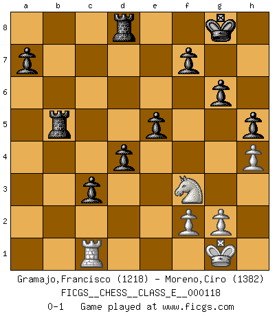 Last move : 0-1 2010 February 4 23:10:6 [Event "FICGS__CHESS__CLASS_E__000118"] [Site "FICGS"] [Date "2010.01.19"] [Round "1"] [White "Gramajo,Francisco"] [Black "Moreno,Ciro"] [Result "0-1"] [WhiteElo "1218"] [BlackElo "1382"] 1.Nf3 c5 2.e4 Nc6 3.Bb5 g6 4.c3 Bg7 5.b3 Qb6 6.a4 Nf6 7.O-O Nxe4 8.Na3 d5 9.d3 Nxc3 10.Bxc6+ Qxc6 11.Qc2 Ne2+ 12.Qxe2 Bxa1 13.Bb2 Bxb2 14.Qxb2 O-O 15.d4 b6 16.Rc1 Ba6 17.Nc2 Qd6 18.dxc5 bxc5 19.Ne5 Rab8 20.Ng4 h5 21.Ne5 d4 22.Nf3 e5 23.Nd2 c4 24.Qa3 Qxa3 25.Nxa3 c3 26.Nf3 Rxb3 27.Nb5 Bxb5 28.axb5 Rxb5 29.h4 Rd8 0-1 Reti Opening Kingside Castling by player White (move 7) Kingside Castling by player Black (move 14) Player Black won this chess game. Follow this game move after move (download)Botvinnik tried to take the mystery out of Chess, always relating it to situations in ordinary life. He used to call Chess a typical inexact problem similar to those which people are always having to solve in everyday life. (Garry Kasparov) Im Fernschach kannst du während dem Spiel rauchen. (John Christen Knudsen) La única cosa que los jugadores de Ajedrez tienen en común, es el Ajedrez. (Lodewijk Prins) On est toujours la mazette de quelqu'un d'autre. (Anonyme) Patience, use the Force, think ! (Obi-Wan Kenobi in Star Wars ep.2)