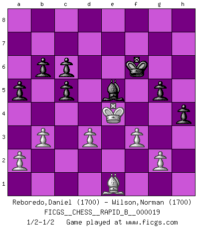 Last move : 1/2-1/2 2007 January 1 23:11:48 [Event "FICGS__CHESS__RAPID_B__000019"] [Site "FICGS"] [Date "2006.10.14"] [Round "1"] [White "Reboredo,Daniel"] [Black "Wilson,Norman"] [Result "1/2-1/2"] [WhiteElo "1700"] [BlackElo "1700"] 1.e4 e5 2.Nf3 Nc6 3.Bb5 a6 4.Bxc6 dxc6 5.d4 exd4 6.Qxd4 Qxd4 7.Nxd4 Bd7 8.Be3 O-O-O 9.Nb3 Bd6 10.f3 f5 11.N1d2 Nf6 12.Bg5 fxe4 13.Nxe4 Be5 14.O-O-O Nxe4 15.Bxd8 Nf2 16.Bh4 Nxd1 17.Rxd1 Bxh2 18.Nc5 Bf4+ 19.Kb1 Bd6 20.Ne4 Be5 21.Nc5 Bf5 22.Nd3 Bd4 23.Re1 Bxd3 24.cxd3 Bc5 25.Re4 Bd6 26.Kc2 Kd7 27.Kd2 Re8 28.Ke3 Re5 29.Rxe5 Bxe5 30.b3 c5 31.Ke4 Ke6 32.Bf2 b6 33.Bh4 Bf6 34.Bg3 c6 35.Be1 h5 36.Bd2 g6 37.Be1 Bg5 38.Bg3 Bd8 39.Bf2 Be7 40.Bg3 h4 41.Be1 Bf6 42.Bf2 Bg5 43.Be1 Bd8 44.Bf2 g5 45.Be3 Kf6 46.Bd2 Bc7 47.Bc3+ Kg6 48.Bd2 Bg3 49.Be3 Bd6 50.Bd2 Kf6 51.Bc3+ Ke6 52.Bd2 Be7 53.Be1 Bd8 54.Bd2 Bf6 55.Be1 Bb2 56.Bd2 Kf6 57.Be3 Bc3 58.Bc1 Bd4 59.Bd2 Ba1 60.Be3 Bb2 61.Bd2 Bd4 62.Bc1 a5 63.Bd2 Bb2 64.Be3 Bc3 65.Bc1 Ba1 66.Bd2 Bd4 67.Be1 Be5 1/2-1/2 Ruy Lopez : Exchange variation Queenside Castling by player Black (move 8) Queenside Castling by player White (move 14) This chess game ended in a draw. Follow this game move after move (download)The stomach is an essential part of the Chess master. (Bent Larsen) Deine Wertungszahl - vorausgesetzt einige Jahre schachliche Anstrengung - entspricht etwa dem zehnfachen Deines IQ plus 1000. (Jonathan Levitt) ¿Porque tengo que perder ante este idiota?. (Aron Nimzovich) Si le désir cupide (et stupide) de gagner est une inépuisable source de souffrance, une combinaison brillante sur l'échiquier est une découverte : le coquelicot qui s'épanouit lorsque apparaît la Voie Lactée. (Arrabal) When a man with money meets a man with experience, the man with experience leaves with money and the man with money leaves with experience. (Anonymous)