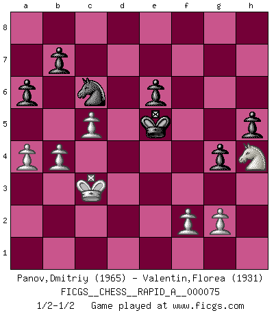 Last move : 1/2-1/2 2010 April 18 19:0:19 [Event "FICGS__CHESS__RAPID_A__000075"] [Site "FICGS"] [Date "2010.01.20"] [Round "1"] [White "Panov,Dmitriy"] [Black "Valentin,Florea"] [Result "1/2-1/2"] [WhiteElo "1965"] [BlackElo "1931"] 1.e4 c5 2.c3 d5 3.exd5 Qxd5 4.d4 Nf6 5.Nf3 Bg4 6.Be2 e6 7.O-O Nc6 8.Be3 cxd4 9.Nxd4 Bxe2 10.Qxe2 Rd8 11.Nd2 Bc5 12.Nxc6 Qxc6 13.Bxc5 Qxc5 14.Nf3 O-O 15.Rad1 h6 16.h3 a6 17.a3 g5 18.c4 Qc7 19.b4 Kg7 20.c5 Rxd1 21.Rxd1 Rd8 22.Rxd8 Qxd8 23.Qd2 Qd7 24.Qxd7 Nxd7 25.Kf1 f5 26.Ke2 Kf6 27.Ke3 h5 28.Kd4 Nb8 29.a4 g4 30.hxg4 Nc6+ 31.Kc3 fxg4 32.Nh4 Ke5 1/2-1/2 Sicilian : Alapin's variation (2.c3) Kingside Castling by player White (move 7) Kingside Castling by player Black (move 14) This chess game ended in a draw. Follow this game move after move (download)Chess is the gymnasium of the mind. (Blaise Pascal) Obwohl ich vom Stil her kaum zu den Priestern der Schachkunst gezählt werde, halte ich Schach doch für eine Kunst. (Tigran Petrosjan) Botvinnik trataba de restarle el misterio al Ajedrez, siempre relacionandolo a situaciones de la vida ordinaria. El gustaba de llamar al Ajedrez un típico problema inexacto similar a aquellos de los cuales la gente siempre tiene que enfrentarse en la vida cotidiana. (Garry Kasparov) La solitude du joueur d'Echecs à l'approche du mat est semblable à celle du condamné. (Francis Szpiner) Either move or be moved. (Ezra Pound)