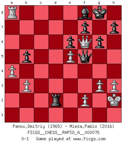 Last move : 0-1 2010 February 17 23:36:13 [Event "FICGS__CHESS__RAPID_A__000075"] [Site "FICGS"] [Date "2010.01.20"] [Round "1"] [White "Panov,Dmitriy"] [Black "Mieza,Pablo"] [Result "0-1"] [WhiteElo "1965"] [BlackElo "2016"] 1.e4 c5 2.c3 Nf6 3.e5 Nd5 4.d4 cxd4 5.cxd4 d6 6.Nf3 Nc6 7.Bc4 dxe5 8.dxe5 Be6 9.Qe2 Qc7 10.O-O Rd8 11.Bd2 g6 12.Nc3 Bg7 13.Nb5 Qb8 14.Rfe1 O-O 15.h3 a6 16.Nbd4 Nf4 17.Bxf4 Nxd4 18.Nxd4 Rxd4 19.Bxe6 Rxf4 20.Bb3 Rd8 21.Qe3 Rfd4 22.Rac1 Rd2 23.Bc2 R8d4 24.b3 b5 25.Bb1 e6 26.g3 Qd8 27.Rc5 Rd1 28.Bc2 Bh6 29.Qe2 Rxe1+ 30.Qxe1 Bd2 31.Qe2 Bb4 32.Rc6 Qd5 33.Rxa6 Kg7 34.a4 Rd2 35.Qe4 Qc5 36.Qf4 Qxc2 37.Qf6+ Kg8 38.Ra7 Qb1+ 39.Kg2 Qe4+ 40.Kh2 Qf5 41.Ra8+ Bf8 0-1 Sicilian : Alapin's variation (2.c3) Kingside Castling by player White (move 10) Kingside Castling by player Black (move 14) Player Black won this chess game. Follow this game move after move (download)Chess is in its essence a game, in its form an art, and in its execution a science. (Baron Tassilo) Schon mancher Spieler hat aufgegeben, um zu vermeiden, daß er eine Figur verliert. (Savielly Grigorievitsch Tartakower) El Ajedrez es como la guerra en un tablero. (Bobby Fischer) Les Echecs sont et restent toujours un combat, un combat intégral comme la boxe, la lutte ou un autre sport, et où il doit y avoir un vainqueur et un vaincu. (Joseph Emil Diemer) Indecision is the key to flexibility. (Unknown)