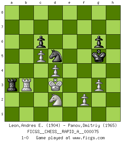 Last move : 1-0 2010 April 6 17:17:49 [Event "FICGS__CHESS__RAPID_A__000075"] [Site "FICGS"] [Date "2010.01.20"] [Round "1"] [White "Leon,Andres E."] [Black "Panov,Dmitriy"] [Result "1-0"] [WhiteElo "1904"] [BlackElo "1965"] 1.e4 e5 2.Nf3 Nf6 3.Nxe5 d6 4.Nf3 Nxe4 5.d4 d5 6.Bd3 Bd6 7.O-O O-O 8.c4 c6 9.Re1 Re8 10.Nc3 Nxc3 11.bxc3 dxc4 12.Bg5 Rxe1+ 13.Qxe1 Qf8 14.Bxc4 Nd7 15.Bd3 f6 16.Qe4 g6 17.Bh6 Qxh6 18.Qe6+ Kh8 19.Qxd6 Qf8 20.Qc7 Nb6 21.c4 Be6 22.c5 Nd5 23.Qxb7 Qc8 24.Ba6 Nb4 25.Qxc8+ Bxc8 26.Bxc8 Rxc8 27.Rb1 Nxa2 28.Ra1 Nb4 29.Rxa7 Kg8 30.g3 Nd5 31.Kf1 Rb8 32.Rd7 Rb1+ 33.Ke2 Rb2+ 34.Nd2 f5 35.Rd6 Nb4 36.Rd8+ Kf7 37.Rd7+ Ke6 38.Rxh7 f4 39.Rb7 Kd5 40.Rd7+ Ke6 41.Rd6+ Kf5 42.Rd8 fxg3 43.Rf8+ Kg5 44.hxg3 Ra2 45.Rb8 Nd5 46.Kd3 Ra3+ 47.Rb3 1-0 Petrov : Classical attack, Marshall variation Kingside Castling by player White (move 7) Kingside Castling by player Black (move 7) Player White won this chess game. Follow this game move after move (download)The Chess pieces are the block alphabet which shapes thoughts; and these thoughts, although making a visual design on the chessboard, express their beauty abstractly, like a poem. (Marcel Duchamp) Ich organisiere ein großes Turnier, was mich etwa 120000 Dollar kostet. Ich denke, das ist das erste Mal in der Schachgeschichte, daß ein Schachgroßmeister auch als Mäzen auftritt. (Miguel Najdorf) La estratégia requiere pensar, la táctica requiere observación. (Max Euwe) J'ai toujours senti une vague pitié pour l'homme qui ne connaît rien aux échecs, tout comme j'en aurais pour un homme ignorant de l'amour. Les Echecs, comme la musique ou comme l'amour, ont le pouvoir de rendre heureux. (Siegbert Tarrasch) Memory is a crazy woman that hoards colored rags and throws away food. (Austin O'Malley)