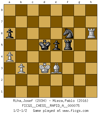 Last move : 1/2-1/2 2010 February 4 17:10:42 [Event "FICGS__CHESS__RAPID_A__000075"] [Site "FICGS"] [Date "2010.01.20"] [Round "1"] [White "Riha,Josef"] [Black "Mieza,Pablo"] [Result "1/2-1/2"] [WhiteElo "2034"] [BlackElo "2016"] 1.e4 c6 2.d4 d5 3.Nc3 dxe4 4.Nxe4 Bf5 5.Ng3 Bg6 6.h4 h6 7.Nf3 Nd7 8.h5 Bh7 9.Bd3 Bxd3 10.Qxd3 e6 11.Bf4 Qa5+ 12.Bd2 Qc7 13.O-O-O Ngf6 14.Ne4 O-O-O 15.g3 Nxe4 16.Qxe4 Bd6 17.c4 Nf6 18.Qe2 c5 19.Bc3 cxd4 20.Nxd4 a6 21.Kb1 Rd7 22.Rc1 Kb8 23.Nf3 Ka8 24.Rhd1 Rhd8 25.Ne5 Bxe5 26.Bxe5 Qa5 27.c5 Rxd1 28.Rxd1 Rc8 29.Bd4 Qa4 30.g4 Rg8 31.f3 Nd5 32.Be5 f6 33.Bd6 Rd8 34.Rd2 Qb4 35.Qd3 Nf4 36.Qd4 Qxd4 37.Rxd4 Nd5 38.f4 b6 39.Re4 Re8 40.cxb6 Nxb6 41.Bb4 Kb7 42.b3 Nd5 43.Bd2 Re7 44.Kc2 Rc7+ 45.Kd3 Rd7 46.Ke2 Rd6 47.Rc4 Nb6 48.Rc1 Nd5 49.g5 hxg5 50.fxg5 fxg5 51.Bxg5 Rd7 52.a3 Rf7 53.Bd2 Rf5 54.Rh1 Kc6 55.Rh4 e5 56.Kd3 Nf6 57.h6 gxh6 58.Rxh6 Kb5 59.a4+ Kc5 60.Be3+ Kd5 1/2-1/2 Caro-Kann : Classical, 7...Nd7 Queenside Castling by player White (move 13) Queenside Castling by player Black (move 14) 10 pieces endgame at move 58 : White KRBPP , Black KRNPP WHITE : King + 1 Rook 1 Bishop 2 Pawns BLACK : King + 1 Rook 1 Knight 2 Pawns This chess game ended in a draw. Follow this game move after move (download)The passed Pawn is a criminal, who should be kept under lock and key. Mild measures, such as police surveillance, are not sufficient. (Aaron Nimzovich) Die Idee von Capablanca, Schach als Fach in den Schulen zu lehren, ist großartig. (Fidel Castro) Sin errores no puede haber brillantez. (Emanuel Lasker) Le jeu d'échecs est comme rejeté hors du temps. (Antoine de Saint-Exupéry) Whatever you do, don't be bored. This is absolutely the most exciting time we could have possibly hoped to be alive. And things are just starting. (From movie Waking life)
