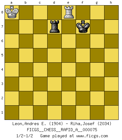 Last move : 1/2-1/2 2010 March 20 17:58:6 [Event "FICGS__CHESS__RAPID_A__000075"] [Site "FICGS"] [Date "2010.01.20"] [Round "1"] [White "Leon,Andres E."] [Black "Riha,Josef"] [Result "1/2-1/2"] [WhiteElo "1904"] [BlackElo "2034"] 1.e4 d6 2.d4 Nf6 3.Nc3 g6 4.Be3 Bg7 5.Qd2 c6 6.f3 b5 7.Nge2 Qa5 8.e5 b4 9.exf6 bxc3 10.fxg7 cxd2+ 11.Bxd2 Qxd2+ 12.Kxd2 Rg8 13.Re1 Rxg7 14.h4 Nd7 15.h5 Ba6 16.hxg6 hxg6 17.Rh8+ Nf8 18.Nf4 Bxf1 19.Rxf1 O-O-O 20.Rfh1 e5 21.dxe5 dxe5 22.Nd3 f6 23.Kc3 Ne6 24.R8h7 Rxh7 25.Rxh7 Rd7 26.Rh6 Rg7 27.Kc4 Kc7 28.Nc5 Kd6 29.Rh1 Nf4 30.a4 Re7 31.g4 f5 32.gxf5 gxf5 33.Rh6+ Kc7 34.b4 Nd5 35.b5 Nb6+ 36.Kd3 cxb5 37.axb5 Kd8 38.Rh5 Nd7 39.Nxd7 Rxd7+ 40.Kc4 Rc7+ 41.Kd5 Rxc2 42.Kxe5 Kc7 43.Kxf5 Kb6 44.Ke6 Rf2 45.Rf5 Re2+ 46.Kd7 Rd2+ 47.Ke7 Re2+ 48.Kd7 Rd2+ 49.Kc8 Rc2 50.Kb8 a5 51.bxa6 Kxa6 52.f4 Kb6 53.Re5 Rd2 54.Re8 Kc6 55.f5 Rb2+ 56.Kc8 Rf2 57.Rf8 Rd2 58.f6 Rc2 59.f7 Ra2 60.Kb8 Rb2+ 61.Kc8 Rb7 62.Kd8 Kd6 63.Kc8 Rc7+ 64.Kb8 Rd7 65.Ka8 Ke7 66.Re8+ Kxf7 1/2-1/2 Pirc defense Queenside Castling by player Black (move 19) 10 pieces endgame at move 39 : White KRPPP , Black KRPPP WHITE : King + 1 Rook 3 Pawns BLACK : King + 1 Rook 3 Pawns 9 pieces endgame at move 41 : White KRPP , Black KRPPP WHITE : King + 1 Rook 2 Pawns BLACK : King + 1 Rook 3 Pawns 8 pieces endgame at move 42 : White KRPP , Black KRPP WHITE : King + 1 Rook 2 Pawns BLACK : King + 1 Rook 2 Pawns 7 pieces endgame at move 43 : White KRPP , Black KRP WHITE : King + 1 Rook 2 Pawns BLACK : King + 1 Rook 1 Pawn 6 pieces endgame at move 51 : White KRPP , Black KR WHITE : King + 1 Rook 2 Pawns BLACK : King + 1 Rook 5 pieces endgame at move 51 : White KRP , Black KR WHITE : King + 1 Rook 1 Pawn BLACK : King + 1 Rook 4 pieces endgame at move 66 : White KR , Black KR WHITE : King + 1 Rook BLACK : King + 1 Rook This chess game ended in a draw. Follow this game move after move (download)When the Chess game is over, the Pawn and the King go back to the same box. (Irish saying) Vielleicht wirkt die Aura früherer Spieler glanzvoller als die der heutigen Spieler, aber das liegt daran, dass man kein Programm wie Fritz hatte, das einem all die Löcher in ihren Partien zeigt. (Vladimir Kramnik) Después de una mala apertura, hay una esperanza en el juego medio. Pero una vez que estas en finales, el momento de la verdad ha llegado. (Edmar Mednis) Les erreurs sont comme les malheurs, elles n'arrivent jamais seules. (Siegbert Tarrasch) The bottom line is always the bottom line. (Johann Piek)