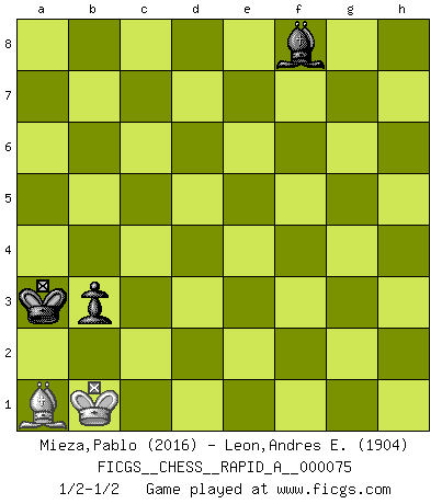 Last move : 1/2-1/2 2010 June 14 15:38:5 [Event "FICGS__CHESS__RAPID_A__000075"] [Site "FICGS"] [Date "2010.01.20"] [Round "1"] [White "Mieza,Pablo"] [Black "Leon,Andres E."] [Result "1/2-1/2"] [WhiteElo "2016"] [BlackElo "1904"] 1.d4 Nf6 2.c4 g6 3.Nc3 Bg7 4.e4 d6 5.Nf3 O-O 6.Be2 e5 7.O-O Nc6 8.d5 Ne7 9.Be3 Ng4 10.Bd2 f5 11.Ng5 Nf6 12.f3 f4 13.Qb3 b6 14.Rfd1 Ne8 15.c5 bxc5 16.Ne6 Bxe6 17.dxe6 Rb8 18.Qa4 c6 19.Qxa7 Nc7 20.Be1 Ra8 21.Qb7 Rb8 22.Qa7 Bf6 23.b3 Kh8 24.Bc4 Ra8 25.Qb6 Rb8 26.Qa7 Rc8 27.Na4 Ra8 28.Qb6 Rb8 29.Qa5 Ra8 30.Qd2 Nc8 31.Qf2 Qe8 32.Nxc5 dxc5 33.Qxc5 Bg7 34.e7 Nxe7 35.a4 Ng8 36.Qd6 Na6 37.Bc3 Bf6 38.Bb2 Qe7 39.Bc3 Rfe8 40.a5 Qc7 41.g4 fxg3 42.hxg3 Red8 43.Qxc7 Nxc7 44.Rxd8 Rxd8 45.a6 Ra8 46.Kg2 Kg7 47.a7 Nb5 48.Bxb5 cxb5 49.Ra6 Kf7 50.Be1 Ne7 51.Bf2 Nc8 52.f4 exf4 53.gxf4 Be7 54.Kf3 Ke8 55.f5 gxf5 56.exf5 Kd7 57.Rh6 Nxa7 58.Ra6 h5 59.Rxa7+ Rxa7 60.Bxa7 Bf6 61.Be3 Kc6 62.Kf4 Kd5 63.Bd2 Kd4 64.Bb4 Kd3 65.Bd6 h4 66.Bb4 h3 67.Kg3 Ke4 68.Kxh3 Kxf5 69.Kg3 Ke4 70.Kg4 Kd3 71.Kf5 Bc3 72.Be7 Kc2 73.Ke6 Kxb3 74.Kd5 Ka4 75.Ke4 Bb2 76.Kd3 Ba3 77.Bh4 b4 78.Bf6 b3 79.Kd2 Bd6 80.Kc1 Ka3 81.Kb1 Bf8 82.Ba1 1/2-1/2 King's Indian : Orthodox, Aronin-Taimanov variation (Yugoslav attack / Mar del Plata variation) Kingside Castling by player Black (move 5) Kingside Castling by player White (move 7) 10 pieces endgame at move 59 : White KRBPP , Black KRBPP WHITE : King + 1 Rook 1 Bishop 2 Pawns BLACK : King + 1 Rook 1 Bishop 2 Pawns 9 pieces endgame at move 59 : White KBPP , Black KRBPP WHITE : King + 1 Bishop 2 Pawns BLACK : King + 1 Rook 1 Bishop 2 Pawns 8 pieces endgame at move 60 : White KBPP , Black KBPP WHITE : King + 1 Bishop 2 Pawns BLACK : King + 1 Bishop 2 Pawns 7 pieces endgame at move 68 : White KBPP , Black KBP WHITE : King + 1 Bishop 2 Pawns BLACK : King + 1 Bishop 1 Pawn 6 pieces endgame at move 68 : White KBP , Black KBP WHITE : King + 1 Bishop 1 Pawn BLACK : King + 1 Bishop 1 Pawn 5 pieces endgame at move 73 : White KB , Black KBP WHITE : King + 1 Bishop BLACK : King + 1 Bishop 1 Pawn This chess game ended in a draw. Follow this game move after move (download)Some sacrifices are sound; the rest are mine. (Mikhail Tal) Im Hotelzimmer gab es nur zwei Schaben. (Über die Turnierbedingungen) (Peter Swidler) Cuando la partida de Ajedrez termina, el Peón y el Rey regresan a la misma caja. (Irish saying) Nous vivons dans un monde échiquéen : chaque jour qui passe est un défi à relever. (Philosophe Sasha) The difference between perseverance and obstinacy is that one comes from a strong will, and the other from a strong won't. (Henry Ward Beecher)