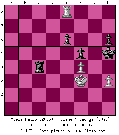 Last move : 1/2-1/2 2010 March 6 15:38:6 [Event "FICGS__CHESS__RAPID_A__000075"] [Site "FICGS"] [Date "2010.01.20"] [Round "1"] [White "Mieza,Pablo"] [Black "Clement,George"] [Result "1/2-1/2"] [WhiteElo "2016"] [BlackElo "2079"] 1.d4 d5 2.c4 c6 3.Nc3 dxc4 4.e4 b5 5.a4 b4 6.Na2 Nf6 7.e5 Nd5 8.Bxc4 a5 9.Nf3 e6 10.Be3 Be7 11.O-O O-O 12.Nc1 Nd7 13.Nd3 Nxe3 14.fxe3 Bb7 15.Rc1 c5 16.Bb5 cxd4 17.Nxd4 Nb6 18.Qd2 Rc8 19.Rxc8 Nxc8 20.Rc1 Na7 21.Nc5 Bxc5 22.Rxc5 Nxb5 23.axb5 h6 24.b3 Be4 25.h3 Qe7 26.Rc4 Rd8 27.Qe2 Qg5 28.Nf3 Qf5 29.Rc5 Kh7 30.Nd4 Qg5 31.b6 Rb8 32.Rb5 Kg8 33.Nf3 Qd8 34.Qd2 Bd3 35.Rxa5 Qxb6 36.Ra4 Be4 37.Qd4 Bc6 38.Qxb6 Rxb6 39.Ra5 Bxf3 40.gxf3 Rc6 41.Rb5 Rc3 42.Rxb4 Rxe3 43.Rb8+ Kh7 44.Kf2 Rxe5 45.Rb7 f5 46.b4 Kg6 47.b5 Kh5 48.f4 Rd5 49.Rxg7 Rxb5 50.Re7 Rb2+ 51.Kg3 Rb3+ 52.Kg2 Rb6 53.Kg3 Ra6 54.Re8 Ra3+ 55.Kg2 Re3 56.Rh8 Re4 57.Kf3 Rc4 58.Re8 1/2-1/2 QGD Slav defense, Alekhine variation Kingside Castling by player White (move 11) Kingside Castling by player Black (move 11) 10 pieces endgame at move 49 : White KRPPP , Black KRPPP WHITE : King + 1 Rook 3 Pawns BLACK : King + 1 Rook 3 Pawns 9 pieces endgame at move 49 : White KRPP , Black KRPPP WHITE : King + 1 Rook 2 Pawns BLACK : King + 1 Rook 3 Pawns This chess game ended in a draw. Follow this game move after move (download)Chess is a foolish expedient for making idle people believe they are doing something very clever when they are only wasting their time. (George Bernard Shaw) Wer wird heute Abend ihr Gegner sein? -- Heute Abend spiele ich gegen die schwarzen Steine. (Akiba Rubinstein) En el Ajedrez, tal como en la vida, las bendiciones de hoy pueden ser el veneno del mañana. (Assaic) Les réformistes prétendent que les progrès de la théorie conduiront à la disparition des échecs, et qu'il faut, pour leur rendre vie, en remanier les règles. En réalité, qu'exprime cette affirmation? Le mépris de l'intuition, de l'imagination et de tous les autres éléments qui font des échecs un art. (Alexander Alekhine) Knowledge rests not upon truth alone, but upon error also. (Carl G. Jung)
