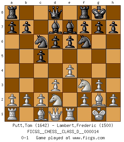 Last move : 0-1 2006 November 5 12:32:53 [Event "FICGS__CHESS__CLASS_D__000014"] [Site "FICGS"] [Date "2006.10.16"] [Round "1"] [White "Putt,Tom"] [Black "Lambert,Frederic"] [Result "0-1"] [WhiteElo "1642"] [BlackElo "1500"] 1.e4 c5 2.Nf3 e6 3.g3 Nc6 4.Bg2 Nf6 5.d3 Be7 6.O-O d6 7.Re1 O-O 8.Nbd2 Bd7 0-1 Sicilian defense Kingside Castling by player White (move 6) Kingside Castling by player Black (move 7) Player Black won this chess game. Follow this game move after move (download)If Chess is a science, it's a most inexact one. If Chess is an art, it is too exacting to be seen as one. If Chess is a sport, it's too esoteric. If Chess is a game, it's too demanding to be just a game. If Chess is a mistress, she's a demanding one. If Chess is a passion, it's a rewarding one. If Chess is life, it's a sad one. (Unknown) Man wirke der falschen Auffassung entgegen, als ob jeder Zug Unmittelbares zu leisten habe; auch Werte- und Ruhezüge haben ihre Existenzberechtigung. (Aaron Nimzowitsch) El Ajedrez es sobre todo, ¡una pelea!. (Emanuel Lasker) Une platitude souvent récitée à propos des Echecs est qu'une des choses les plus difficiles à réaliser est de gagner une position gagnante. Cela ne manque pas de sens mais, pour ma part, j'ai toujours trouvé plus difficile de gagner une position perdante. (Tim Krabbe) Perfection is achieved, not when there is nothing more to add, but when there is nothing left to take away. (Antoine de Saint-Exupéry)
