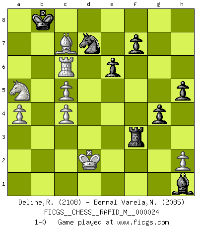 Last move : 1-0 2010 April 7 2:39:6 [Event "FICGS__CHESS__RAPID_M__000024"] [Site "FICGS"] [Date "2010.01.20"] [Round "1"] [White "Deline,Ralph"] [Black "Bernal Varela,Nelson"] [Result "1-0"] [WhiteElo "2108"] [BlackElo "2085"] 1.e4 c5 2.c3 d5 3.exd5 Qxd5 4.d4 Nc6 5.Nf3 Bf5 6.Be3 Nf6 7.Na3 e6 8.dxc5 O-O-O 9.Bb5 Bxc5 10.Qxd5 Rxd5 11.Bxc6 bxc6 12.Nc4 Nd7 13.b4 Bd3 14.Bxc5 Bxc4 15.Bxa7 c5 16.Nd2 Re5+ 17.Kd1 Bd5 18.c4 Bb7 19.bxc5 Kc7 20.Rb1 Ra8 21.Bb6+ Kc8 22.Rb2 Rg5 23.Rg1 Rxg2 24.Rxg2 Bxg2 25.Kc2 g5 26.Nb3 Ra4 27.Kc3 g4 28.Rd2 h5 29.Nc1 Ne5 30.Rd4 Bc6 31.Nb3 Nd7 32.Rd6 Bh1 33.Nc1 Ra3+ 34.Kb4 Rh3 35.Kb5 Ne5 36.Ne2 Rd3 37.Nd4 Rd2 38.a4 Kb7 39.Nb3 Rb2 40.Kb4 Ka6 41.Bd8 Kb7 42.Kc3 Rxf2 43.Na5+ Kc8 44.Bb6 Rf3+ 45.Kd2 Nd7 46.Rc6+ Kb8 47.Bc7+ 1-0 Sicilian : Alapin's variation (2.c3) Queenside Castling by player Black (move 8) Player White won this chess game. Follow this game move after move (download)A bad plan is better than none at all. (Frank Marshall) Alles was am Schachbrett zählt sind gute Züge. (Robert James Fischer) Aquel que teme a un Peón de Reina aislado, deberÃa de retirarse del Ajedrez. (Siegbert Tarrasch) Les Echecs sont et restent toujours un combat, un combat intégral comme la boxe, la lutte ou un autre sport, et où il doit y avoir un vainqueur et un vaincu. (Joseph Emil Diemer) Empty your mind, be formless, shapeless — like water. (Bruce Lee)