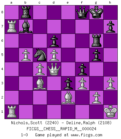 Last move : 1-0 2010 February 4 15:43:35 [Event "FICGS__CHESS__RAPID_M__000024"] [Site "FICGS"] [Date "2010.01.20"] [Round "1"] [White "Nichols,Scott"] [Black "Deline,Ralph"] [Result "1-0"] [WhiteElo "2240"] [BlackElo "2108"] 1.e4 c5 2.Nf3 Nc6 3.d4 cxd4 4.Nxd4 Nf6 5.Nc3 e5 6.Ndb5 d6 7.Nd5 Nxd5 8.exd5 Nb8 9.c4 Be7 10.Bd3 O-O 11.O-O a6 12.Nc3 f5 13.f3 Nd7 14.Be3 Bg5 15.Bf2 b6 16.b4 g6 17.Kh1 Bb7 18.Qb3 Rc8 19.a4 Bf6 20.Be2 Qe7 21.Rfc1 Qg7 22.a5 e4 23.axb6 e3 24.Bg3 Bxc3 25.Rxc3 f4 26.Be1 Nxb6 27.R3c1 Rf5 28.b5 a5 29.Bxa5 Nd7 30.Qd1 Qh6 31.Bc3 Rh5 32.Qg1 Rb8 33.Bd4 Qg5 34.Ra7 Qg3 35.Bc3 Qh4 36.Ba5 Rh6 37.Ra1 g5 38.h3 Nc5 39.Qd1 Rg6 40.Bb4 Qh6 41.Qd4 Qf8 42.Bc3 1-0 Sicilian : Pelikan (Lasker/Sveshnikov) variation Kingside Castling by player Black (move 10) Kingside Castling by player White (move 11) Player White won this chess game. Follow this game move after move (download)Pawn endings are to Chess what putting is to golf. (Cecil Purdy) Zeige mir drei Eröffnungsvarianten und ich beweise dir, dass zwei davon inkorrekt sind. (Emanuel Lasker) Debió haber existido una vez en que los hombres eran semidióses, de otra manera no hubiesen podido inventar el Ajedrez. (Gustav Schenk) Mais l'homme est une créature légère et illogique : semblable au joueur d'échecs, il n'aime que le processus du but à atteindre, non le but lui-même. (Dostoïevsky) History is a gallery of pictures in which there are few originals and many copies. (Alexis de Tocqueville)