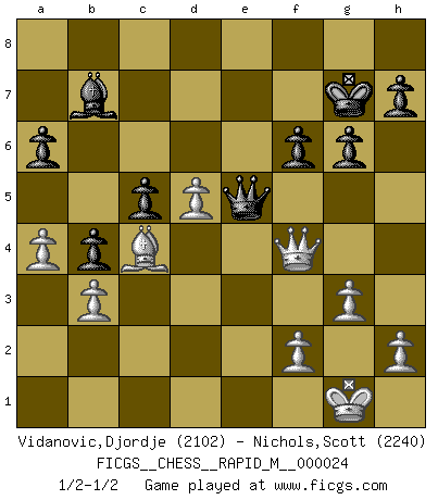 Last move : 1/2-1/2 2010 March 2 23:20:9 [Event "FICGS__CHESS__RAPID_M__000024"] [Site "FICGS"] [Date "2010.01.20"] [Round "1"] [White "Vidanovic,Djordje"] [Black "Nichols,Scott"] [Result "1/2-1/2"] [WhiteElo "2102"] [BlackElo "2240"] 1.d4 d5 2.c4 c6 3.Nf3 Nf6 4.e3 e6 5.Nc3 Nbd7 6.Qc2 Bd6 7.Bd3 dxc4 8.Bxc4 O-O 9.O-O b5 10.Be2 Bb7 11.Bd2 a6 12.e4 e5 13.a3 exd4 14.Nxd4 g6 15.Bh6 Re8 16.Rad1 Bb8 17.Nf3 Qc7 18.g3 c5 19.a4 b4 20.Nd5 Nxd5 21.exd5 Nf6 22.Bc4 Qd7 23.Bg5 Ng4 24.b3 Bd6 25.Rfe1 Ne5 26.Nxe5 Bxe5 27.Be3 Qd6 28.Re2 Re7 29.Bg5 f6 30.Bf4 Rae8 31.Rde1 Kg7 32.Qd2 Bxf4 33.Rxe7+ Rxe7 34.Rxe7+ Qxe7 35.Qxf4 Qe5 1/2-1/2 QGD Slav : 4.e3 Kingside Castling by player Black (move 8) Kingside Castling by player White (move 9) This chess game ended in a draw. Follow this game move after move (download)Chess makes man wiser and clear-sighted. (Vladimir Putin) Ich glaube, ich kenne inzwischen die Gründe für mein Versagen: schachliche Charakterfehler. Ich war nie ein Wunderkind und in meiner gesamten menschlichen Entwicklung immer zu langsam. (Viktor Kortschnoi) Creo que una cierta cantidad de temperamento es esperada de los genios del Ajedrez. (Ron Gross) La victoire dans une partie d'Echecs appartient la plupart du temps à celui qui voit un peu plus loin que l'adversaire. (Lasker) Luck has a peculiar habit of favoring those who don't depend on it. (Author unknown)
