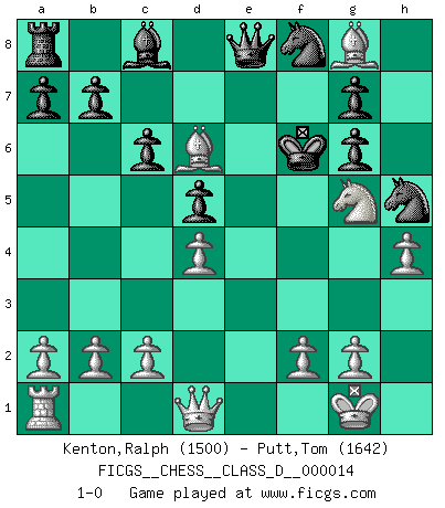 Last move : 1-0 2006 November 3 20:2:5 [Event "FICGS__CHESS__CLASS_D__000014"] [Site "FICGS"] [Date "2006.10.16"] [Round "1"] [White "Kenton,Ralph"] [Black "Putt,Tom"] [Result "1-0"] [WhiteElo "1500"] [BlackElo "1642"] 1.e4 e6 2.d4 d5 3.exd5 exd5 4.Nf3 Be7 5.Bd3 Nf6 6.O-O O-O 7.Bf4 Re8 8.Nbd2 c6 9.Ne5 Bd6 10.Ndf3 Nbd7 11.Re1 Nh5 12.Bxh7+ Kf8 13.Ng6+ fxg6 14.Bxd6+ Kf7 15.Rxe8 Qxe8 16.Ng5+ Kf6 17.h4 Nf8 18.Bg8 1-0 French : Exchange variation Kingside Castling by player White (move 6) Kingside Castling by player Black (move 6) Player White won this chess game. Follow this game move after move (download)Human affairs are like a Chess game: only those who do not take it seriously can be called good players. (Hung Tzu Ch'eng) Die unerbitterlichsten Regeln im Schach sind die Ausnahmen. (Savielly Grigorievitsch Tartakower) Preferería tener un Peón que un dedo. (Reuben Fine) Les pièces de l'échiquier étaient impitoyables. Elles le retenaient, elles l'absorbaient. Il y avait de l'horreur en cela, mais aussi une harmonie unique. Car, qu'y a-t-il dans le monde, à part les échecs ? (V. Nabokov) The weakness of an artist is dogma. (Josh Waitzkin)