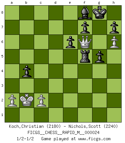 Last move : 1/2-1/2 2010 February 22 23:31:59 [Event "FICGS__CHESS__RAPID_M__000024"] [Site "FICGS"] [Date "2010.01.20"] [Round "1"] [White "Koch,Christian"] [Black "Nichols,Scott"] [Result "1/2-1/2"] [WhiteElo "2180"] [BlackElo "2240"] 1.d4 d5 2.e4 dxe4 3.Nc3 Nf6 4.f3 exf3 5.Nxf3 g6 6.Bg5 Bg7 7.Qd2 O-O 8.O-O-O Bf5 9.Bd3 Bxd3 10.Qxd3 Nbd7 11.h4 c6 12.Kb1 Re8 13.Rhe1 Qc7 14.Qe3 b5 15.Bxf6 Nxf6 16.Ne5 b4 17.Na4 Nd7 18.h5 Nxe5 19.dxe5 e6 20.b3 Rad8 21.Rxd8 Rxd8 22.Nb2 Rd5 23.Nd3 c5 24.g4 Rd4 25.h6 Bf8 26.g5 a5 27.Rf1 Be7 28.Qg3 Qd8 29.Qf3 Qe8 30.Nf2 Bxg5 31.Ne4 Be7 32.Kb2 Qf8 33.Qe3 Rd7 34.Qf4 Rd5 35.Kc1 Bd8 36.Re1 a4 37.bxa4 c4 38.Kb2 Ra5 39.Nd6 Rxa4 40.Qxc4 Bg5 41.Qc7 Bf4 42.Kb1 Ra8 43.Re2 Ra3 44.Qb7 Ra5 45.Re4 g5 46.Rc4 Rxe5 47.Rc8 Re1+ 48.Kb2 Bxd6 49.Rxf8+ Bxf8 50.Qa8 Rd1 51.Qf3 Rd5 52.Qf6 Rf5 1/2-1/2 Blackmar gambit Kingside Castling by player Black (move 7) Queenside Castling by player White (move 8) This chess game ended in a draw. Follow this game move after move (download)A passed Pawn increases in strength as the number of pieces on the board diminishes. (Capablanca) Dass jemand wie Surab Asmaiparaschwili, der selbst Elopunkte gekauft hat , Vize-Präsident der Fide werden konnte, sagt schon einges über den Zustand dieser Organisation aus. (Joel Lautier) Una buena memoria, concentración, imaginación y una fuerte voluntad, se requiere para llegar a ser un buen jugador. (Bobby Fischer) L'action d'une oeuvre littéraire se déroule sur un champ de bataille. Les masques et les types du drame moderne correspondent aux pièces du jeu d'échecs. L'intrigue correspond aux coups et aux gambits, c'est à dire aux techniques du jeu telles qu'utilisées et interprétées par les joueurs. Les tactiques et les péripéties [mouvements] correspondent aux coups exécutés par l'adversaire. (Viktor Shklovsky) Some people are so afraid to die that they never begin to live. (Henry Van Dyke)