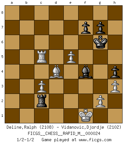 Last move : 1/2-1/2 2010 March 20 3:21:1 [Event "FICGS__CHESS__RAPID_M__000024"] [Site "FICGS"] [Date "2010.01.20"] [Round "1"] [White "Deline,Ralph"] [Black "Vidanovic,Djordje"] [Result "1/2-1/2"] [WhiteElo "2108"] [BlackElo "2102"] 1.e4 e5 2.Nf3 Nc6 3.Bc4 Be7 4.d4 exd4 5.Nxd4 Nf6 6.Nxc6 bxc6 7.e5 Ne4 8.Qf3 d5 9.exd6 Nxd6 10.O-O O-O 11.Bd3 Bf6 12.Qxc6 Bb7 13.Qa4 c5 14.Rd1 Qb6 15.Na3 Bd4 16.Qb3 Ne4 17.Bxe4 Bxe4 18.Qxb6 axb6 19.c3 Bf6 20.Nc4 Rfd8 21.Be3 Rxd1+ 22.Rxd1 Rxa2 23.f3 b5 24.fxe4 bxc4 25.Rd5 Rxb2 26.Rxc5 h6 27.e5 Bg5 28.Bd4 Kh7 29.Rxc4 Kg6 30.Rb4 Rc2 31.Rb7 h5 32.Kf1 h4 33.h3 Bf4 34.Rd7 Bg5 35.Ra7 Bf4 36.Re7 Bg5 37.Rd7 Bd2 38.Rc7 Bf4 39.Rc5 1/2-1/2 Hungarian defense Kingside Castling by player White (move 10) Kingside Castling by player Black (move 10) This chess game ended in a draw. Follow this game move after move (download)For surely of all the drugs in the world, Chess must be the most permanently pleasurable. (Assiac) Ein Schachspiel besteht aus drei Phasen: Die erste, wenn du hofftst den Vorteil zu haben, die zweite, wenn du glaubst einen Vorteil zu haben, und die dritte.... wenn du weißt Du wirst verlieren. (Savielly Grigorievitsch Tartakower) En el Ajedrez, tal como en la vida, las bendiciones de hoy pueden ser el veneno del mañana. (Assaic) Mais n'est-ce pas déjà le limiter injurieusement que d'appeler les échecs un jeu? N'est-ce pas aussi une science, un art, ou quelque chose qui, comme le cercueil de Mahomet entre ciel et terre, est suspendu entre l'un et l'autre, et qui réunit un nombre incroyable de contraires ? (Stefan Zweig) If you have any trouble condescending, find a Unix user to show you how it's done. (Scott Adams)