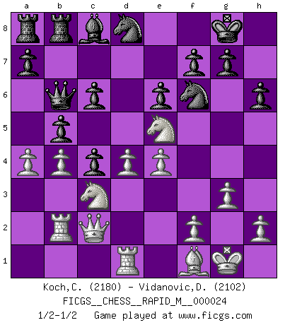 Last move : 1/2-1/2 2010 April 1 21:55:27 [Event "FICGS__CHESS__RAPID_M__000024"] [Site "FICGS"] [Date "2010.01.20"] [Round "1"] [White "Koch,Christian"] [Black "Vidanovic,Djordje"] [Result "1/2-1/2"] [WhiteElo "2180"] [BlackElo "2102"] 1.d4 Nf6 2.c4 e6 3.g3 Bb4+ 4.Bd2 Qe7 5.Nf3 Bxd2+ 6.Qxd2 Nc6 7.e3 b6 8.Nc3 O-O 9.Bg2 Rb8 10.O-O Ba6 11.b3 d5 12.Qb2 Rfd8 13.Nd2 h6 14.Rab1 Na5 15.Rfd1 c6 16.Nf3 Qb4 17.Ne1 Qe7 18.Qc2 Qc7 19.e4 dxc4 20.b4 Nb7 21.a4 b5 22.Ra1 Qb6 23.Nf3 Ra8 24.Bf1 Rdb8 25.Ra2 Nd8 26.Ne5 Bc8 27.Rb2 1/2-1/2 Catalan Opening Kingside Castling by player Black (move 8) Kingside Castling by player White (move 10) This chess game ended in a draw. Follow this game move after move (download)Half the variations which are calculated in a tournament game turn out to be completely superfluous. Unfortunately, no one knows in advance which half. (Jan Tinman) Ich könnte leicht behaupten: Ja,ja, Leonid Breschnew wollte nicht, daß ich Weltmeister werde. In der Tat war die Sache komplizierter. (Viktor Kortschnoi) Diferente gente reacciona diferentemente en aceptar la derrota. (Bobby Fischer) Assurément je connaissais par expérience le mystérieux attrait de ce jeu royal, le seul entre tous les jeux inventés par les hommes qui échappe souverainement à la tyrannie du hasard, le seul où l'on ne doive sa victoire qu'à son intelligence ou plutôt à une certaine forme d'intelligence. Mais n'est-ce pas déjà le limiter injurieusement que d'appeler les échecs un jeu ? N'est-ce pas une science, un art ou quelque chose qui, comme le cercueil de Mahomet entre ciel et terre, est suspendu entre l'un et l'autre, et qui réunit un nombre incroyable de contraires ? [...] C'est une pensée qui ne mène à rien, une mathématique qui n'établit rien, un art qui ne laisse pas d'uvre, une architecture sans matière; et il l'a prouvé néanmoins qu'il était plus durable, à sa manière, que les livres ou que tout autre monument, ce jeu unique qui appartient à tous les peuples et à tous les temps, et dont personne ne sait quel dieu en fit don à la terre pour tuer l'ennui, pour aiguiser l'esprit et stimuler l'âme. Où commence-t-il, où finit-il ? (Stefan Zweig) A journey of a thousand sites begins with a single click. (Author unknown)