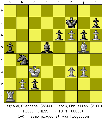 Last move : 1-0 2010 May 31 7:48:0 [Event "FICGS__CHESS__RAPID_M__000024"] [Site "FICGS"] [Date "2010.01.20"] [Round "1"] [White "Legrand,Stephane"] [Black "Koch,Christian"] [Result "1-0"] [WhiteElo "2244"] [BlackElo "2180"] 1.d4 d5 2.c4 dxc4 3.Nf3 Nf6 4.e3 e6 5.Bxc4 c5 6.O-O a6 7.Bb3 b5 8.a4 b4 9.Nbd2 Bb7 10.e4 Be7 11.e5 Nfd7 12.Nc4 O-O 13.Bc2 cxd4 14.Bf4 Nc5 15.Nxd4 Qd5 16.Ne3 Qd7 17.Nb3 Nxb3 18.Bxb3 Rd8 19.Qg4 Nc6 20.Rad1 Qc7 21.h4 Rd4 22.h5 Rad8 23.Qg3 Rxd1 24.Bxd1 Qa5 25.h6 g6 26.Kh2 Qc5 27.Bf3 Rd3 28.Be4 Rd7 29.Ng4 Qc4 30.Re1 b3 31.Qe3 Nb4 32.Bg5 Nd5 33.Qd2 f5 34.exf6 Bb4 35.Qc1 Qd4 36.f3 Rc7 37.Rd1 Bd6+ 38.g3 Rxc1 39.Rxd4 Re1 40.Bd2 Re2+ 41.Kh3 a5 42.Bc3 Kf7 43.Bd3 Rc2 44.Bxc2 bxc2 45.Bd2 Ba6 46.Kg2 Be2 47.Bc1 Bb4 48.Re4 Ba6 49.Bg5 Bd6 50.Ne5+ Bxe5 51.Rxe5 Bc4 52.Kf2 Bb3 53.Ke1 Bxa4 54.Kd2 Bb3 55.Re1 Nb4 56.Kc3 Bd5 57.Ra1 1-0 QGA : Classical, 6...a6 Kingside Castling by player White (move 6) Kingside Castling by player Black (move 12) Player White won this chess game. Follow this game move after move (download)There is only one thing Fischer does in Chess without pleasure: to lose ! (Boris Spassky) Unter Putin wird alles Geld aus Russland wie von einem Staubsauger nach Moskau umgeleitet, das ist wie ein schwarzes Loch. (Garry Kasparov) Alguna parte de un error es siempre correcto. (Savielly Tartakover) Lorsque vous vous retrouvez devant une position atroce, ne tendez pas un ultime piège dérisoire avec l'intention d'abandonner si l'adversaire le déjoue ! Faites-vous plutôt un devoir de résister comme si votre vie en dépendait. Jouez le coup qui vous déplairait au centuple si vous étiez dans la peau de votre tortionnaire ! Have no fear of perfection - you'll never reach it. (Salvador Dali)