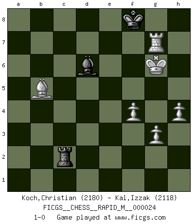 Last move : 1-0 2010 June 27 9:50:41 [Event "FICGS__CHESS__RAPID_M__000024"] [Site "FICGS"] [Date "2010.01.20"] [Round "1"] [White "Koch,Christian"] [Black "Kal,Izzak"] [Result "1-0"] [WhiteElo "2180"] [BlackElo "2118"] 1.d4 Nf6 2.c4 g6 3.Nc3 Bg7 4.e4 d6 5.Nf3 O-O 6.Be2 e5 7.O-O Nc6 8.d5 Ne7 9.b4 a5 10.Ba3 axb4 11.Bxb4 Nd7 12.a4 Bh6 13.a5 f5 14.Bd3 Kh8 15.Re1 c5 16.dxc6 Nxc6 17.Bxd6 Rf6 18.Nb5 Rxa5 19.exf5 gxf5 20.Bc7 Rxa1 21.Qxa1 Qg8 22.Nxe5 Ndxe5 23.Bxe5 Nxe5 24.Qxe5 Bg7 25.Qe7 Qf8 26.Na7 b6 27.Qxf8+ Rxf8 28.Nxc8 Rxc8 29.Bxf5 Ra8 30.g3 Ra1 31.Bb1 Kg8 32.Kg2 Bc3 33.Rc1 Bf6 34.Rd1 Kf7 35.f4 h6 36.Kf3 Ke7 37.Kg4 Ra4 38.Re1+ Kf7 39.Be4 Kg7 40.Bd5 Ra2 41.h4 Rd2 42.Re6 b5 43.Rc6 bxc4 44.Bxc4 Be7 45.Rc7 Kf8 46.Kh5 Ke8 47.Kxh6 Bd6 48.Bb5+ Kf8 49.Rg7 Rg2 50.Kh7 Rb2 51.Rg5 Rc2 52.Rg8+ Kf7 53.Rg7+ Kf8 54.Kg6 1-0 King's Indian : Orthodox, Aronin-Taimanov variation (Yugoslav attack / Mar del Plata variation) Kingside Castling by player Black (move 5) Kingside Castling by player White (move 7) 10 pieces endgame at move 44 : White KRBPPP , Black KRBP WHITE : King + 1 Rook 1 Bishop 3 Pawns BLACK : King + 1 Rook 1 Bishop 1 Pawn 9 pieces endgame at move 47 : White KRBPPP , Black KRB WHITE : King + 1 Rook 1 Bishop 3 Pawns BLACK : King + 1 Rook 1 Bishop Player White won this chess game. Follow this game move after move (download)The most important feature of the Chess position is the activity of the pieces. This is absolutely fundamental in all phases of the game: Opening, Middlegame and especially Endgame. The primary constraint on a piece's activity is the Pawn structure. (Michael Stean) Wie kann ich Remis annehmen? Ich weiß ja gar nicht, wie ich stehe! (Fritz Sämisch) Nada excita más a Grandes Maestros aburridos que una novedad teórica. (Dominic Lawson) Il vaut toujours mieux jouer un plan faux de façon logique que de n'avoir pas de plan du tout. (Victor Kortchnoï) The mind is like a parachute, it only functions when its open. (Unknown)