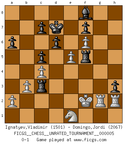 Last move : 0-1 2010 February 17 4:49:57 [Event "FICGS__CHESS__UNRATED_TOURNAMENT__000005"] [Site "FICGS"] [Date "2010.01.21"] [Round "1"] [White "Ignatyev,Vladimir"] [Black "Domingo,Jordi"] [Result "0-1"] [WhiteElo "1501"] [BlackElo "2067"] 1.e4 e5 2.f4 exf4 3.Nf3 d6 4.Bc4 h6 5.h4 Nf6 6.Nc3 Bg4 7.d4 Be7 8.Bxf4 Nh5 9.Qd2 Bxf3 10.gxf3 Bxh4+ 11.Ke2 Nc6 12.Bb5 a6 13.Bxc6+ bxc6 14.Rag1 Rb8 15.b3 Qf6 16.Rg4 Nxf4+ 17.Qxf4 Qxd4 18.Qe3 Qxe3+ 19.Kxe3 Bf6 20.Ne2 h5 21.Rg2 Kd7 22.Nf4 g6 23.Nd3 g5 24.c4 c5 25.Rgh2 h4 26.f4 g4 27.e5 Be7 28.f5 h3 29.f6 Rbg8 30.Rg1 g3 31.R2h1 g2 32.Rh2 Rg3+ 33.Ke2 Bf8 34.Ne1 Rh5 35.Kf2 Rc3 36.R1xg2 Rf5+ 0-1 KGA : Fischer defense Player Black won this chess game. Follow this game move after move (download)Chess, like love, like music, has the power to make people happy. (Siegbert Tarrasch) Die Leute spielen gegen mich seit 15 Jahren unter Ihren Möglichkeiten. (Robert James Fischer) El Ajedrez es de 30 a 40 por ciento psicología. Uno no cuenta con esto cuando se juega contra una computadora. No lo puedo confundir. (Judith Polgar) On entre au jeu d'Echecs comme on entre en Religion. Pour le joueur d'Echecs, la partie d'Echecs c'est l'office, la messe, le défilé du 1er Mai, le dépôt de gerbe au Monument aux Morts. C'est un drame sacré. (Michel Roos) Vladimir Ras-Putin is still alive... He is also a good actor, I saw him in the Lord of the Rings. (Rodolfo d'Ettorre)