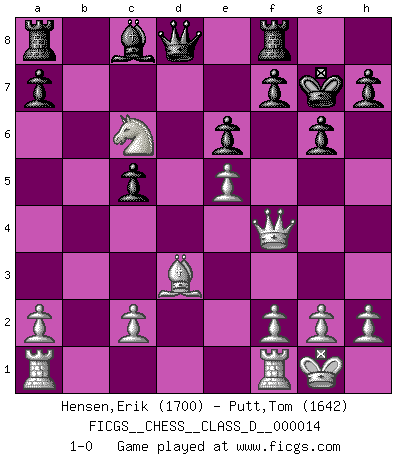 Last move : 1-0 2006 October 29 9:36:39 [Event "FICGS__CHESS__CLASS_D__000014"] [Site "FICGS"] [Date "2006.10.16"] [Round "1"] [White "Hensen,Erik"] [Black "Putt,Tom"] [Result "1-0"] [WhiteElo "1700"] [BlackElo "1642"] 1.e4 e6 2.d4 d5 3.Nd2 Nf6 4.e5 Ne4 5.Bd3 Nxd2 6.Bxd2 c5 7.dxc5 Bxc5 8.Qg4 g6 9.Nf3 Bf8 10.O-O Bg7 11.Bb4 Nc6 12.Bd6 Bf8 13.Bxf8 Kxf8 14.Qf4 Kg7 15.b4 d4 16.b5 Rf8 17.bxc6 bxc6 18.Nxd4 c5 19.Nc6 1-0 French : Tarrasch, Closed variation Kingside Castling by player White (move 10) Player White won this chess game. Follow this game move after move (download)It's just you and your opponent at the board and you're trying to prove something. (Bobby Fischer) Ich war schon mal beim Dopingtest. Da musste ich Urin abgeben, während Dritte zusahen. (Elisabeth Pähtz) El juego de Fischer siempre fue nítido, racional y brillante. Uno de los mejores por siempre. (Dave Regis) Il s'avisa de me proposer d'apprendre les échecs qu'il jouait un peu... me voilà forcené des échecs. J'achète un échiquier, je m'enferme dans ma chambre, j'y passe des jours et des nuits à vouloir apprendre par cur toutes les parties. (Jean-Jacques Rousseau, Confessions) Coffee just isn't my cup of tea. (Unknown)