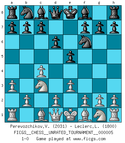 Last move : 1-0 2010 March 21 21:27:36 [Event "FICGS__CHESS__UNRATED_TOURNAMENT__000005"] [Site "FICGS"] [Date "2010.01.21"] [Round "1"] [White "Perevozchikov,Vjacheslav"] [Black "Leclerc,Luc-Olivier"] [Result "1-0"] [WhiteElo "2031"] [BlackElo "1800"] 1.a3 e5 2.c4 Nf6 3.Nc3 d6 4.e3 1-0 This chess game has been lost on time (started : 2010.01.21 0:17:47) Anderssen's Opening Player White won this chess game. Follow this game move after move (download)I'd rather have a Pawn than a finger. (Reuben Fine) Das Schach ist nichts für kleine Geister, es beansprucht einen vollen Mann, der sich nicht sklavisch an das Überlieferte hält, sondern selbständig die Tiefen des Spiels zu ergründen sucht. (Wilhelm Steinitz) Me gusta decir que Bobby Fischer fue el mejor jugador que jamás haya existido. Pero lo que hizo de Fischer un genio, fue su habilidad de mezclar una frescura y pragmatismo Americano con ideas Rusas acerca de la estrategia. (Bruce Pandolfini) Avec des compensations pour le matériel en plus... (Anonyme) Players are not good because they find tactics, it is about the way to find the positions in which those tactics are hidden. (Luc-Olivier Leclerc)